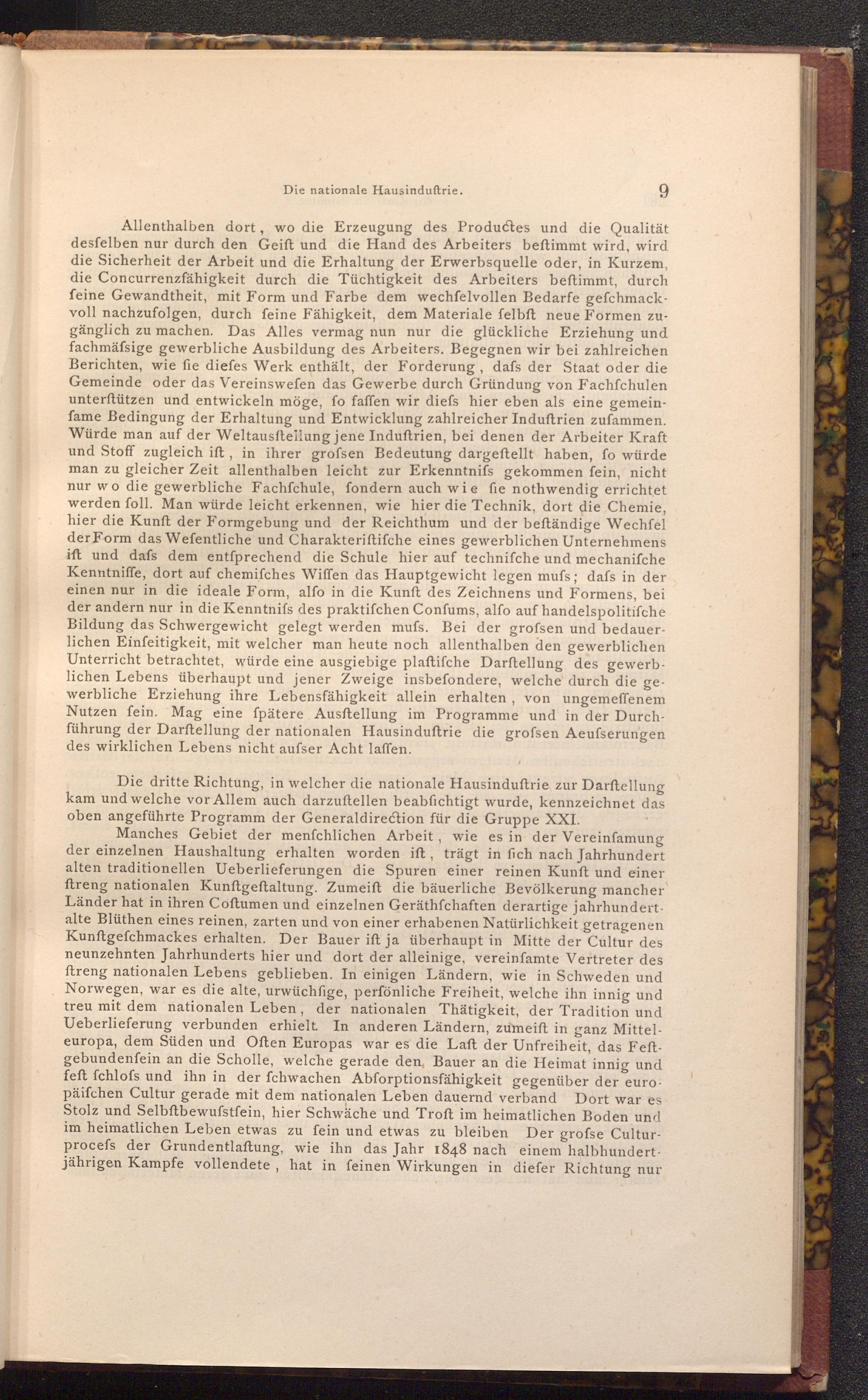 Die dritte Richtung, in welcher die nationale Hausinduftrie zur Darstellung kam und welche vor Allem auch darzuftellen beabfichtigt wurde, kennzeichnet das oben angeführte Programm der Generaldirection für die Gruppe XXI.
