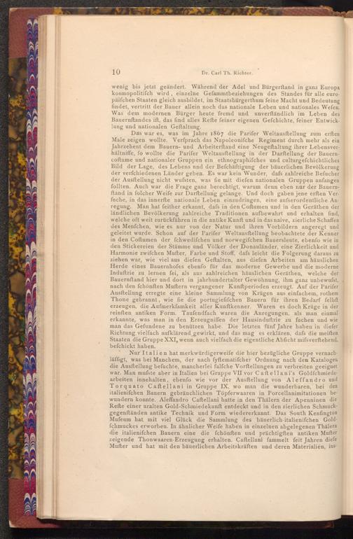 Nur Italien hat merkwürdigerweife die hier bezügliche Gruppe vernachläffigt, was bei Manchem, der nach fyftematifcher Ordnung nach den Katalogen die Ausstellung befuchte, mancherlei falfche Vorftellungen zu verbreiten geeignet war. Man mufste aber in Italien bei Gruppe VII vor Caftellani's Goldfchmiedearbeiten innehalten, ebenfo wie vor der Ausftellung von Aleffandro und Torquato Caftellani in Gruppe IX, wo man die wunderbaren, bei den italienifchen Bauern gebräuchlichen Töpferwaaren in Porcellanimitationen bewundern konnte. Aleffandro Caftellani hatte in den Thälern der Apenninen die Refte einer uralten Gold- Schmiedekunft entdeckt und in den zierlichen Schmuckgegenständen antike Technik und Form wiedererkannt. Das South Kenfington Muſeum hat mit viel Glück die Sammlung des bäuerlich- italienifchen Goldfchmuckes erworben. In ähnlicher Weife haben in einzelnen abgelegenen Thälern die italienifchen Bauern eine die fchönften und prächtigften antiken Mufter zeigende Thonwaaren- Erzeugung erhalten. Caftellani fammelt feit Jahren diefe Mufter und hat mit den bäuerlichen Arbeitskräften und deren Materialien, ins