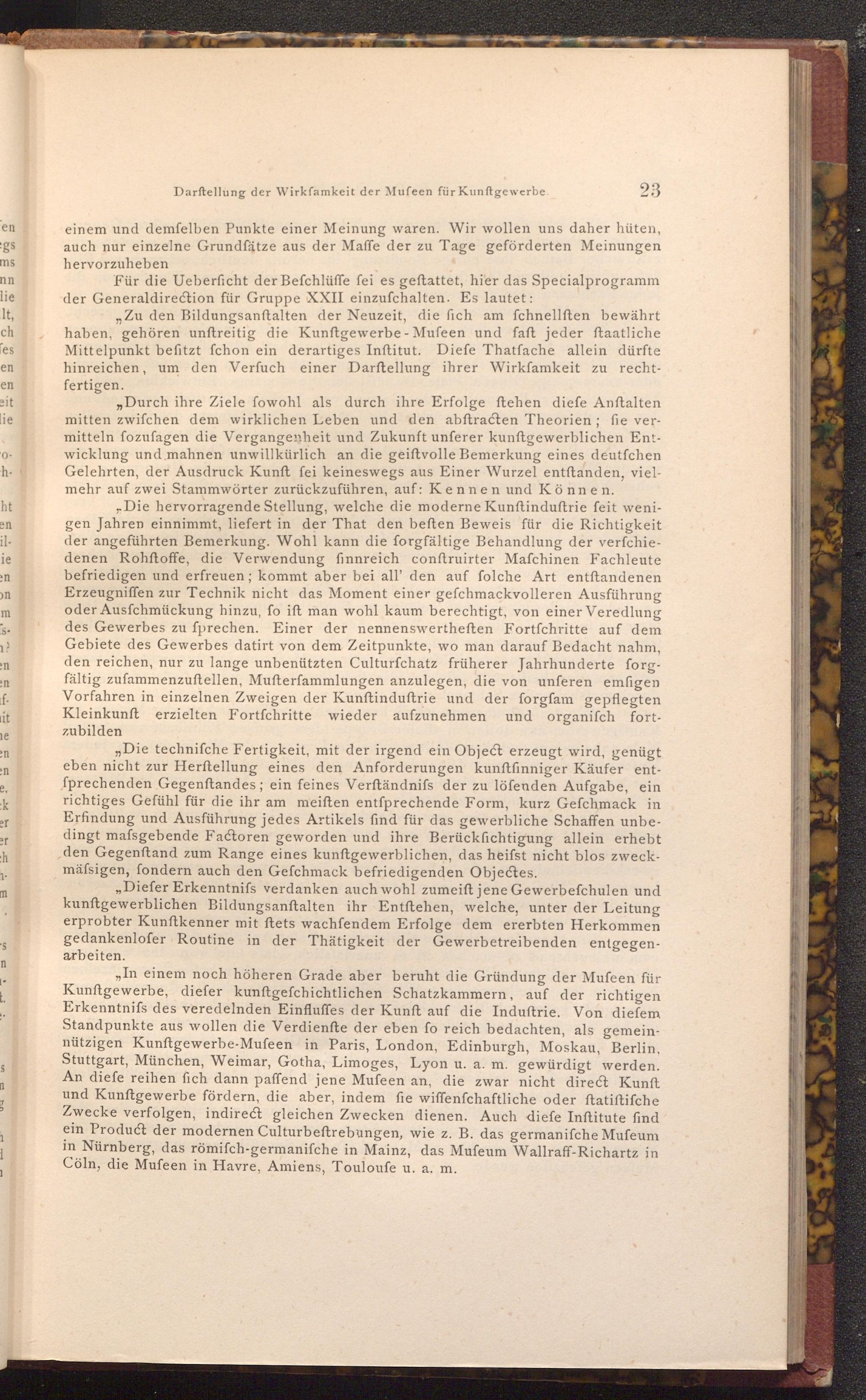 ,, In einem noch höheren Grade aber beruht die Gründung der Muſeen für Kunstgewerbe, diefer kunftgefchichtlichen Schatzkammern, auf der richtigen Erkenntnifs des veredelnden Einfluffes der Kunft auf die Induftrie. Von diefem Standpunkte aus wollen die Verdienfte der eben fo reich bedachten, als gemeinnützigen Kunft gewerbe- Muſeen in Paris, London, Edinburgh, Moskau, Berlin, Stuttgart, München, Weimar, Gotha, Limoges, Lyon u. a. m. gewürdigt werden. An diefe reihen fich dann paffend jene Mufeen an, die zwar nicht direct Kunft und Kunstgewerbe fördern, die aber, indem fie wiffenfchaftliche oder ſtatiſtiſche Zwecke verfolgen, indirect gleichen Zwecken dienen. Auch diefe Inftitute find ein Product der modernen Culturbeftrebungen, wie z. B. das germanifche Muſeum in Nürnberg, das römifch- germanifche in Mainz, das Muſeum Wallraff- Richartz in Cöln, die Muſeen in Havre, Amiens, Touloufe u. a. m.