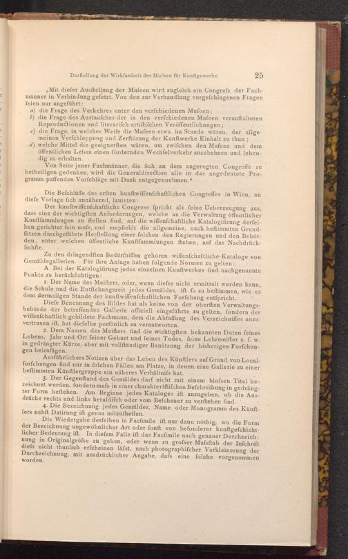 Der kunftwiffenfchaftliche Congress fpricht als feine Ueberzeugung aus, dass eine der wichtigften Anforderungen, welche an die Verwaltung öffentlicher Kunftfammlungen zu ftellen find, auf die wiffenfchaftliche Katalogifirung derfelben gerichtet fein mufs, und empfiehlt die allgemeine, nach beftimmten Grundfätzen durchgeführte Herſtellung einer folchen den Regierungen und den Behörden, unter welchen öffentliche Kunftfammlungen ftehen, auf das Nachdrücklichfte.