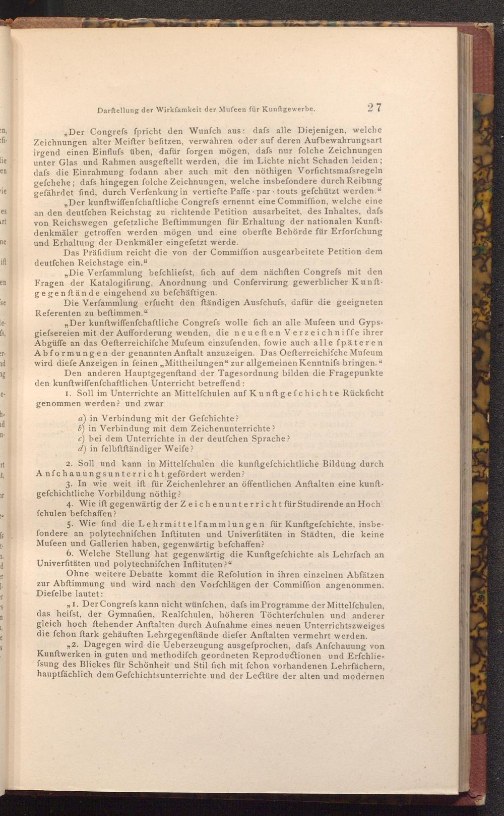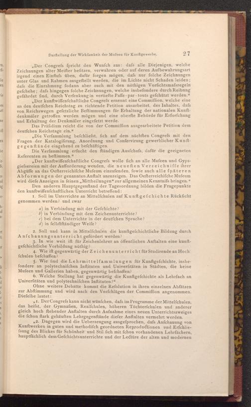 ,, I. Der Congrefs kann nicht wünſchen, dafs im Programme der Mittelfchulen, das heifst, der Gymnafien, Realfchulen, höheren Töchterfchulen und anderer gleich hoch ftehender Anftalten durch Aufnahme eines neuen Unterrichtszweiges die fchon ftark gehäuften Lehrgegenftände diefer Anftalten vermehrt werden. 2. Dagegen wird die Ueberzeugung ausgefprochen, dafs Anfchauung von Kunftwerken in guten und methodifch geordneten Reproductionen und Erfchliefsung des Blickes für Schönheit und Stil fich mit fchon vorhandenen Lehrfächern, hauptfächlich dem Gefchichtsunterrichte und der Lectüre der alten und modernen