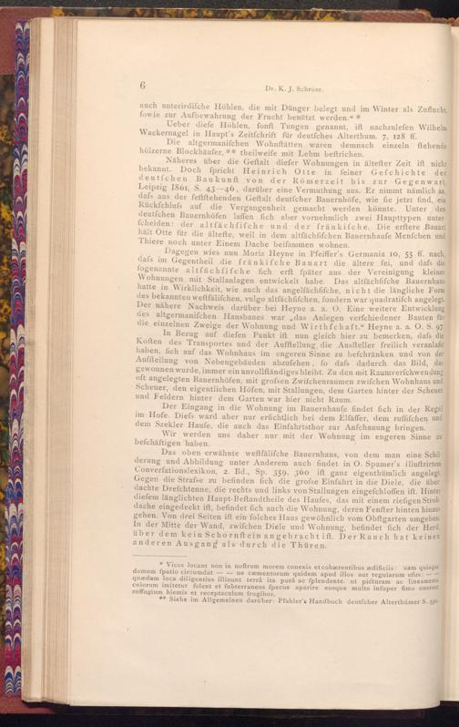 Näheres über die Geftalt diefer Wohnungen in ältefter Zeit ist nicht bekannt. Doch fpricht Heinrich Otte in feiner Gefchichte der deutfchen Baukunft von der Römerzeit bis zur Gegenwart, Leipzig 1861, S. 43-46, darüber eine Vermuthung aus. Er nimmt nämlich an, dafs aus der feftftehenden Geftalt deutfcher Bauernhöfe, wie fie jetzt find, ein Rückfchluss auf die Vergangenheit gemacht werden könnte. Unter den deutfchen Bauernhöfen laffen fich aber vornehmlich zwei Haupttypen unter fcheiden: der altfächfifche und der fränkifche. Die erftere Bauart hält Otte für die ältefte, weil in dem altfächfifchen Bauernhaufe Menfchen und Thiere noch unter Einem Dache beifammen wohnen.