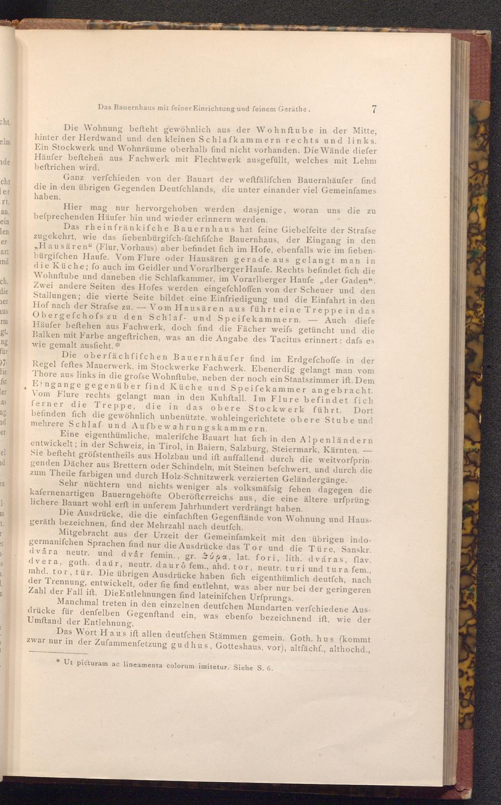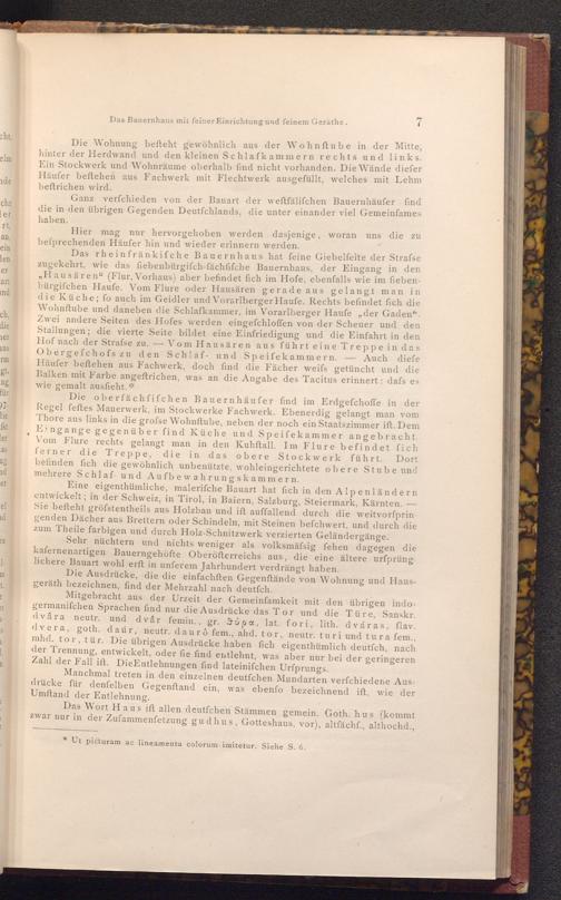 Das rhein fränkifche Bauernhaus hat feine Giebelfeite der Strafse zugekehrt, wie das fiebenbürgifch- fächfifche Bauernhaus, der Eingang in den " Hausären"( Flur, Vorhaus) aber befindet fich im Hofe, ebenfalls wie im fiebenbürgifchen Haufe. Vom Flure oder Hausären gerade aus gelangt man in die Küche; fo auch im Geidler und Vorarlberger Haufe. Rechts befindet fich die Wohnftube und daneben die Schlafkammer, im Vorarlberger Haufe der Gaden". Zwei andere Seiten des Hofes werden eingefchloffen von der Scheuer und den Stallungen; die vierte Seite bildet eine Einfriedigung und die Einfahrt in den Hof nach der Strafse zu. Vom Hausären aus führt eine Treppe in das Obergefchofs zu den Schlaf- und Speifekammern. Auch diefe Häufer beftehen aus Fachwerk, doch find die Fächer weifs getüncht und die Balken mit Farbe angeftrichen, was an die Angabe des Tacitus erinnert: dafs es wie gemalt ausfieht.*