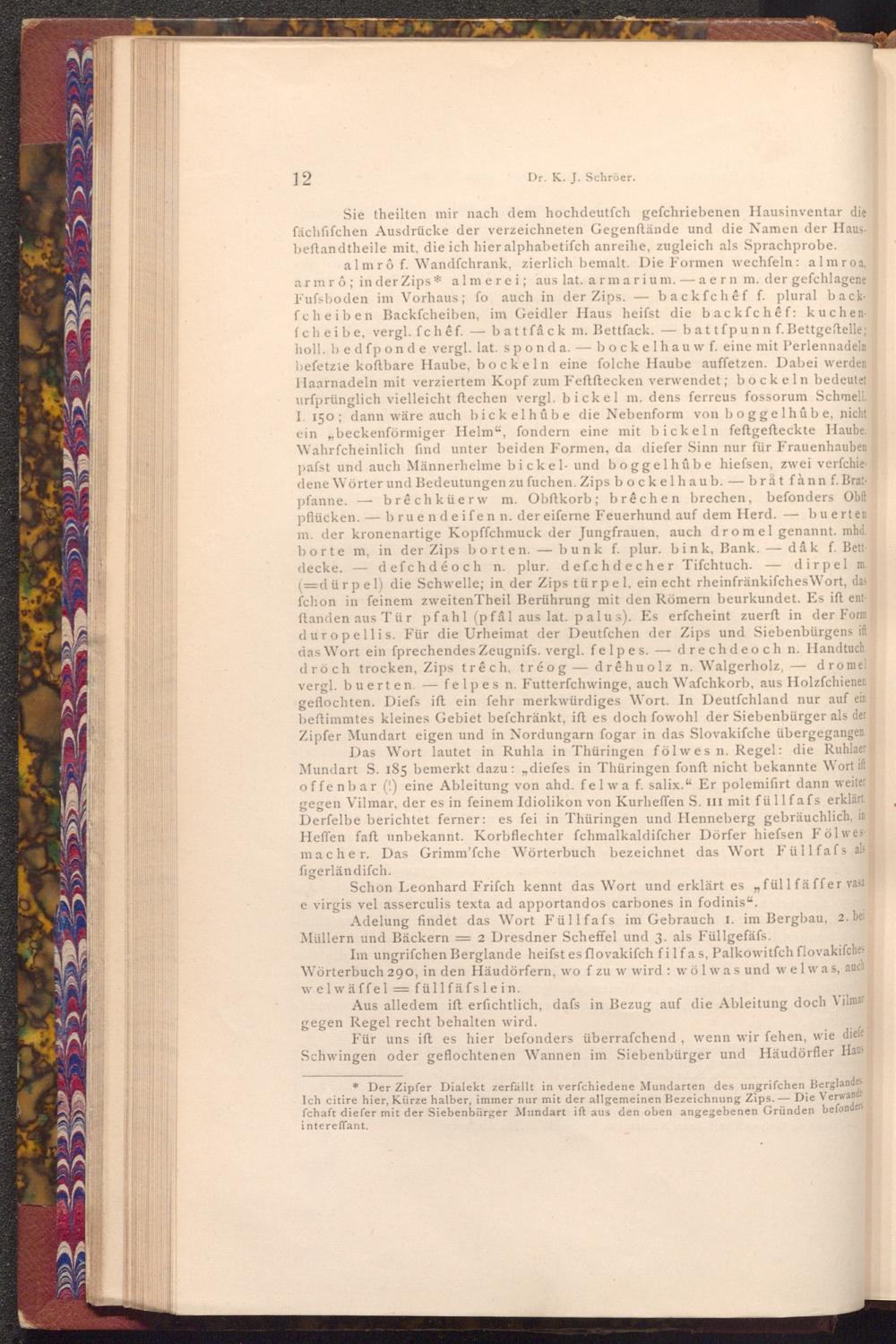 almrô f. Wandfchrank, zierlich bemalt. Die Formen wechſeln: almroa armrô; in der Zips* almerei; aus lat. armarium.- aern m. der gefchlagene Fufsboden im Vorhaus; fo auch in der Zips. backfchêf f. plural backfcheiben Backfcheiben, im Geidler Haus heifst die backfchêf: kuchenfcheibe, vergl. fchêf.battfâck m. Bettfack.- battfpunn f. Bettgestelle; holl. bedfponde vergl. lat. sponda.bockelhauw f. eine mit Perlennadeln befetzie koftbare Haube, bockeln eine folche Haube auffetzen. Dabei werden Haarnadeln mit verziertem Kopf zum Feftftecken verwendet; bockeln bedeutet urfprünglich vielleicht ftechen vergl. bickel m. dens ferreus fossorum Schmell. I. 150; dann wäre auch bickelhûbe die Nebenform von boggelhûbe, nicht ein„ beckenförmiger Helm", fondern eine mit bickeln feftgefteckte Haube. Wahrfcheinlich find unter beiden Formen, da diefer Sinn nur für Frauenhauben pafst und auch Männerhelme bickel- und boggelhûbe hiefsen, zwei verfchiedene Wörter und Bedeutungen zu fuchen. Zips bockelhaub.- bråt fànn f. Bratpfanne.- brêchküerw m. Obftkorb; brêchen brechen, befonders Obft pflücken.bruendeifen n. der eiferne Feuerhund auf dem Herd.- buerten m. der kronenartige Kopffchmuck der Jungfrauen, auch dromel genannt. mhd. borte m, in der Zips borten. bunk f. plur. bink, Bank.- dâk f. Bettdecke.defchdéoch n. plur. def.chdecher Tifchtuch. dirpel m. (= dürpel) die Schwelle; in der Zips türpel, ein echt rheinfränkifches Wort, das fchon in feinem zweiten Theil Berührung mit den Römern beurkundet. Es ift ent ftanden aus Tür pfahl( pfâl aus lat. palus). Es erfcheint zuerft in der Form duropellis. Für die Urheimat der Deutfchen der Zips und Siebenbürgens ift das Wort ein fprechendes Zeugnifs. vergl. felpes. drechdeoch n. Handtuch, dröch trocken, Zips trêch, tréog- drêhuolz n. Walgerholz, vergl. buerten.- felpes n. Futterfchwinge, auch Wafchkorb, aus Holzfchienen geflochten. Diefs ift ein fehr merkwürdiges Wort. In Deutſchland nur auf ein beftimmtes kleines Gebiet befchränkt, ift es doch fowohl der Siebenbürger als der Zipfer Mundart eigen und in Nordungarn fogar in das Slovakifche übergegangen. Das Wort lautet in Ruhla in Thüringen fölwes n. Regel: die Ruhlaer Mundart S. 185 bemerkt dazu: ,, diefes in Thüringen fonft nicht bekannte Wort ift offenbar(!) eine Ableitung von ahd. felwa f. salix." Er polemifirt dann weiter gegen Vilmar, der es in feinem Idiolikon von Kurheffen S. III mit füllfafs erklärt. Derfelbe berichtet ferner: es fei in Thüringen und Henneberg gebräuchlich, in Heffen faft unbekannt. Korbflechter fchmalkaldifcher Dörfer hiefsen Fölwes macher. Das Grimm'fche Wörterbuch bezeichnet das Wort Füllfafs als figerländifch.