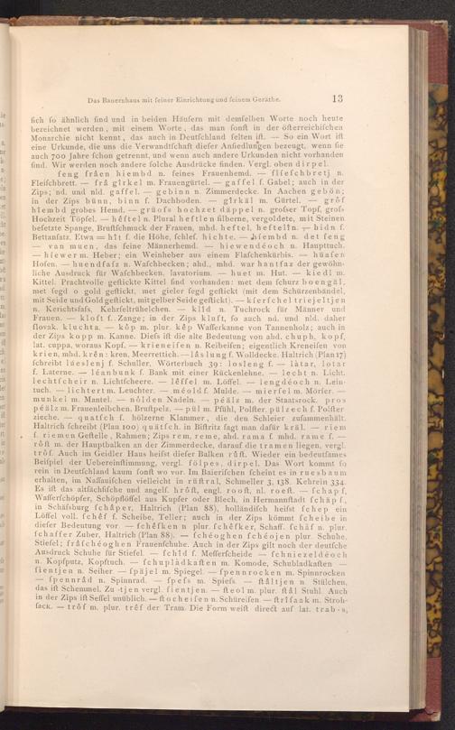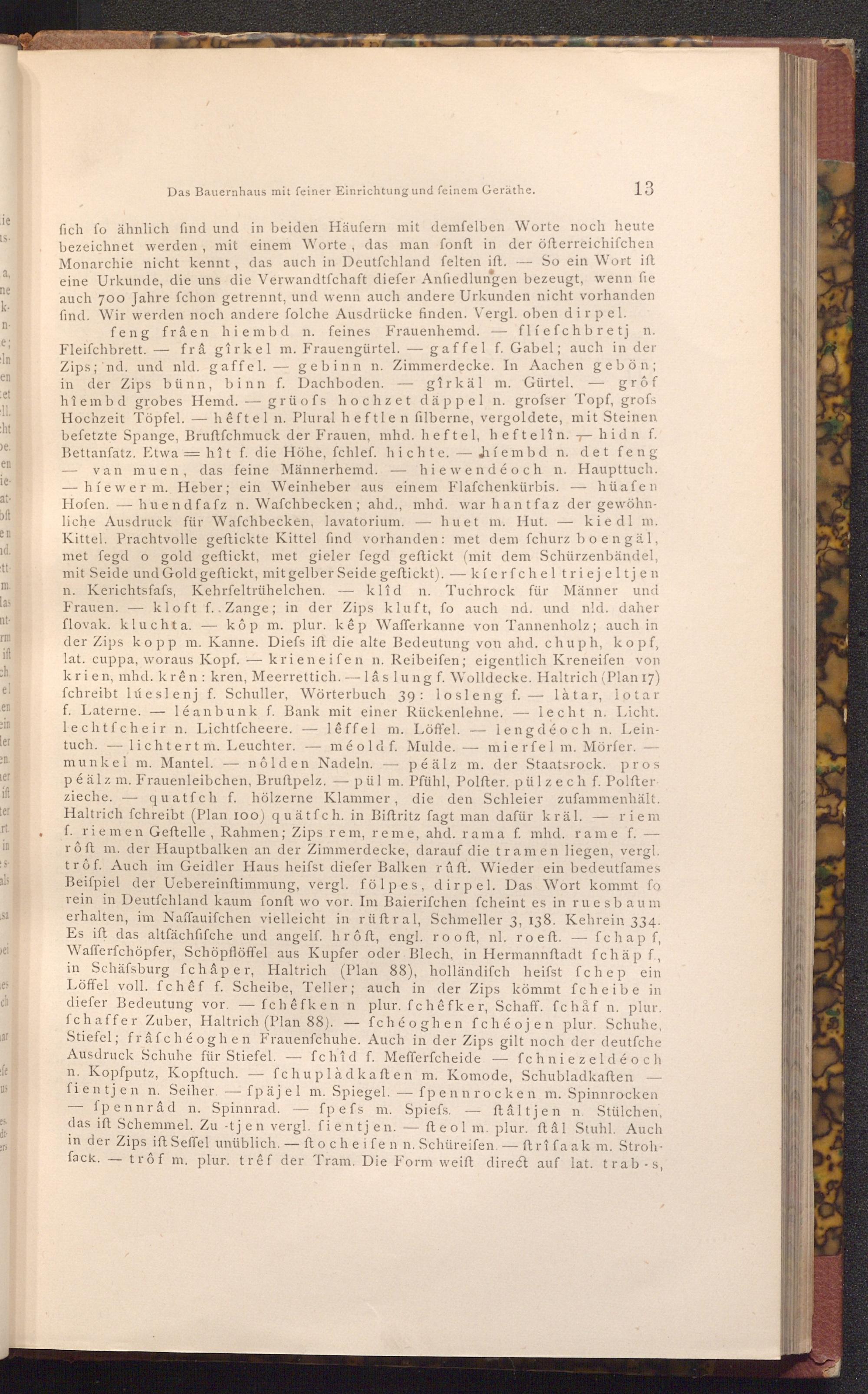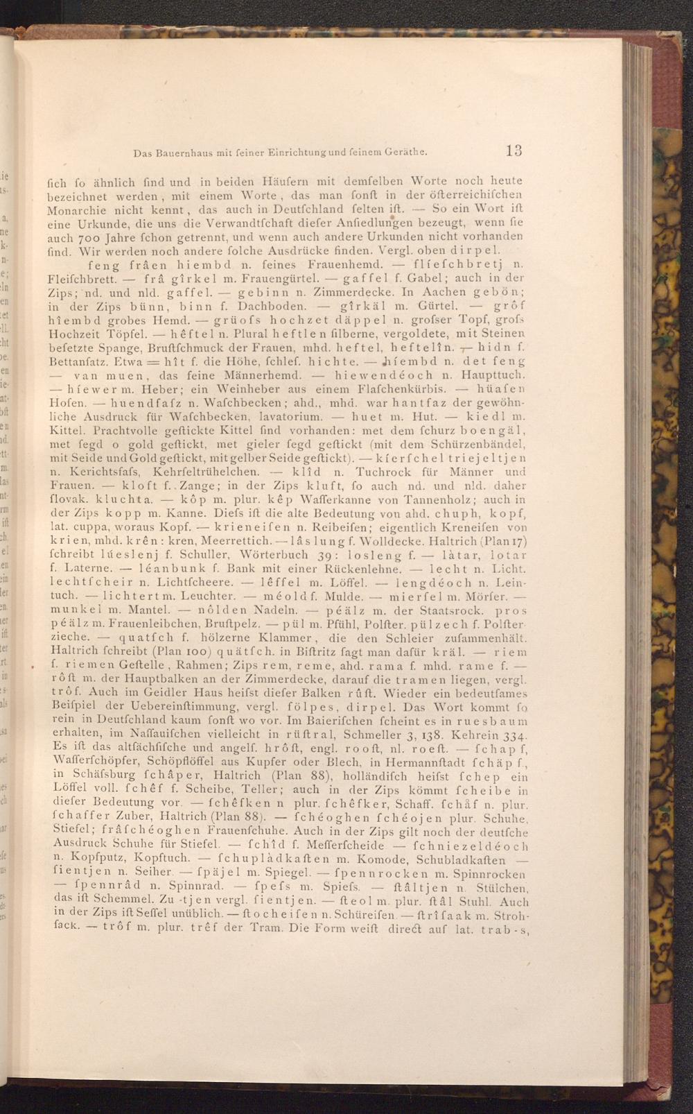 feng frâen hiem bd n. feines Frauenhemd. flíefchbretj n. Fleiſchbrett. frâ gîrkel m. Frauengürtel. gaffel f. Gabel; auch in der Zips; nd. und nld. gaffel. gebinn n. Zimmerdecke. In Aachen gebön; in der Zips bünn, binn f. Dachboden. gîrkäl m. Gürtel, grôf hiem bd grobes Hemd. grüofs hochzet däppel n. grofser Topf, grofs Hochzeit Töpfel. hêftel n. Plural heftlen filberne, vergoldete, mit Steinen befetzte Spange, Bruftfchmuck der Frauen, mhd. heftel, heftelîn.hidn f. Bettanfatz. Etwahît f. die Höhe, fchlef. hichte.híembd n. det feng van muen, das feine Männerhemd. hiewendéoch n. Haupttuch. -híewer m. Heber; ein Weinheber aus einem Flafchenkürbis. hüafen Hofen. huendfafz n. Wafchbecken; ahd., mhd. war hantfaz der gewöhnliche Ausdruck für Wafchbecken, lavatorium. huet m. Hut. kiedl m. Kittel. Prachtvolle geftickte Kittel find vorhanden: met dem fchurz boengäl, met fegd o gold geftickt, met gieler fegd geftickt( mit dem Schürzenbändel, mit Seide und Gold geftickt, mit gelber Seide geftickt).-kíerfchel triejeltjen n. Kerichtsfafs, Kehrfeltrühelchen. klîd n. Tuchrock für Männer und Frauen. kloft f..Zange; in der Zips kluft, fo auch nd. und nld. daher flovak. kluchta. kôp m. plur. kêp Wafferkanne von Tannenholz; auch in der Zips kopp m. Kanne. Diefs ift die alte Bedeutung von ahd. chuph, kopf, lat. cuppa, woraus Kopf.krieneifen n. Reibeifen; eigentlich Kreneifen von krien, mhd. krên: kren, Meerrettich.- lâs lung f. Wolldecke. Haltrich( Plan 17) fchreibt lúeslenj f. Schuller, Wörterbuch 39: losleng f. làtar, lotar f. Laterne. léanbunk f. Bank mit einer Rückenlehne.lecht n. Licht. lechtfcheir n. Lichtfcheere. lêffel m. Löffel. lengdéoch n. Leintuch. lichtert m. Leuchter. mé old f. Mulde. mierfel m. Mörfer. munkel m. Mantel.- nôlden Nadeln. péälz m. der Staatsrock. pros péälz m. Frauenleibchen, Bruftpelz.pül m. Pfühl, Polfter. pülzech f. Polfterzieche. quatfch f. hölzerne Klammer, die den Schleier zufammenhält. Haltrich fchreibt( Plan 100) quätfch. in Biftritz fagt man dafür kräl.- riem f. riemen Geftelle, Rahmen; Zips rem, reme, ahd. rama f. mhd. rame f.- rôft m. der Hauptbalken an der Zimmerdecke, darauf die tramen liegen, vergl. trôf. Auch im Geidler Haus heifst diefer Balken rûft. Wieder ein bedeutfames Beiſpiel der Uebereinftimmung, vergl. fölpes, dirpel. Das Wort kommt fo rein in Deutfchland kaum fonft wo vor. Im Baierifchen fcheint es in ruesbaum erhalten, im Naffauifchen vielleicht in rüftral, Schmeller 3, 138. Kehrein 334. Es ift das altfächfifche und angelf. hrôft, engl. rooft, nl. ro eft.- fchap f, Wafferfchöpfer, Schöpflöffel aus Kupfer oder Blech, in Hermannftadt fchäp f., in Schäfsburg fchâper, Haltrich( Plan 88), holländifch heifst fchep ein Löffel voll. fchêf f. Scheibe, Teller; auch in der Zips kömmt fcheibe in diefer Bedeutung vor. fchêfken n plur. fchêfker, Schaff. fchåf n. plur. fchaffer Zuber, Haltrich( Plan 88). fchéoghen fchéojen plur. Schuhe, Stiefel; frâfchéoghen Frauenfchuhe. Auch in der Zips gilt noch der deutfche Ausdruck Schuhe für Stiefel. fchid f. Mefferfcheide- fchniezeldéoch