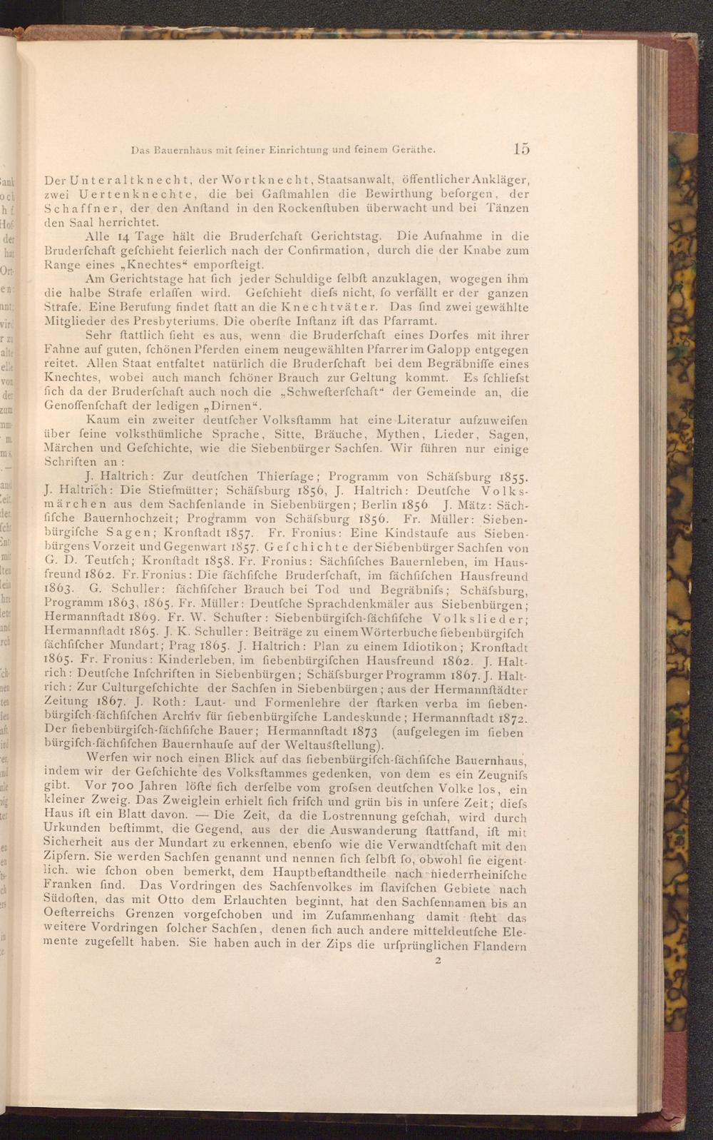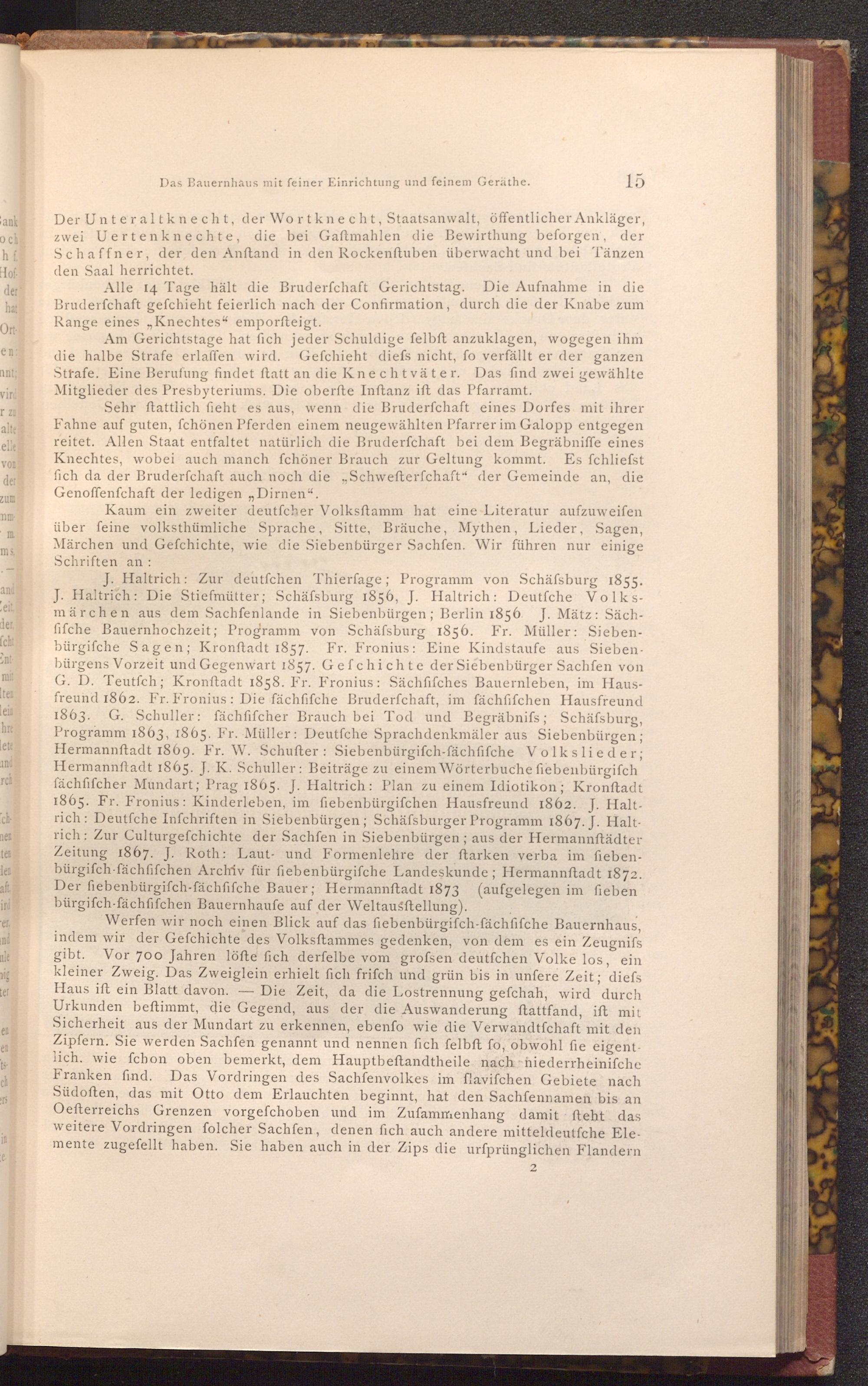 J. Haltrich: Zur deutfchen Thierfage; Programm von Schäfsburg 1855. J. Haltrich: Die Stiefmütter; Schäfsburg 1856, J. Haltrich: Deutfche Volksmärchen aus dem Sachfenlande in Siebenbürgen; Berlin 1856. J. Mätz: Sächfifche Bauernhochzeit; Programm von Schäfsburg 1856. Fr. Müller: Siebenbürgifche Sagen; Kronftadt 1857. Fr. Fronius: Eine Kindstaufe aus Siebenbürgens Vorzeit und Gegenwart 1857. Gefchichte der Siebenbürger Sachfen von G. D. Teutfch; Kronftadt 1858. Fr. Fronius: Sächfifches Bauernleben, im Hausfreund 1862. Fr. Fronius: Die fächfifche Bruderfchaft, im fächfifchen Hausfreund 1863. G. Schuller: fächfifcher Brauch bei Tod und Begräbnifs; Schäfsburg, Programm 1863, 1865. Fr. Müller: Deutfche Sprachdenkmäler aus Siebenbürgen; Hermannftadt 1869. Fr. W. Schufter: Siebenbürgifch- fächfifche Volkslieder; Hermannftadt 1865. J. K. Schuller: Beiträge zu einem Wörterbuche fiebenbürgifch fächfifcher Mundart; Prag 1865. J. Haltrich: Plan zu einem Idiotikon; Kronftadt 1865. Fr. Fronius: Kinderleben, im fiebenbürgifchen Hausfreund 1862. J. Haltrich: Deutfche Infchriften in Siebenbürgen; Schäfsburger Programm 1867. J. Haltrich: Zur Culturgefchichte der Sachfen in Siebenbürgen; aus der Hermannftädter Zeitung 1867. J. Roth: Laut- und Formenlehre der ftarken verba im fiebenbürgifch fächfifchen Archiv für fiebenbürgifche Landeskunde; Hermannftadt 1872. Der fiebenbürgifch- fächfifche Bauer; Hermannftadt 1873( aufgelegen im fieben bürgifch- fächfifchen Bauernhaufe auf der Weltausstellung).