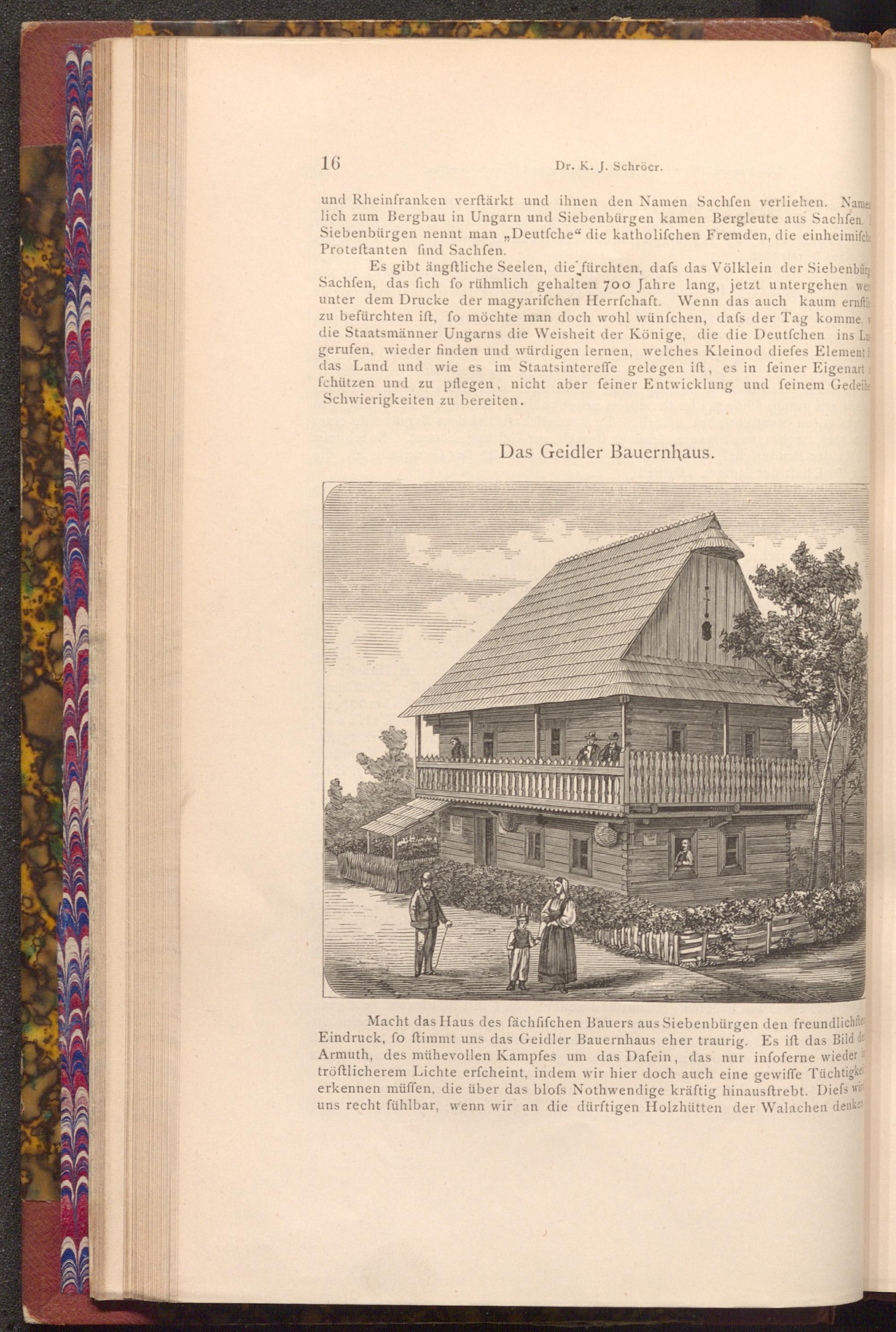 Macht das Haus des fächfifchen Bauers aus Siebenbürgen den freundlichfie Eindruck, fo ftimmt uns das Geidler Bauernhaus eher traurig. Es ift das Bild de Armuth, des mühevollen Kampfes um das Dafein, das nur infoferne wieder i tröftlicherem Lichte erfcheint, indem wir hier doch auch eine gewiffe Tüchtigke erkennen müffen, die über das blofs Nothwendige kräftig hinausftrebt. Diefs wi uns recht fühlbar, wenn wir an die dürftigen Holzhütten der Walachen denken