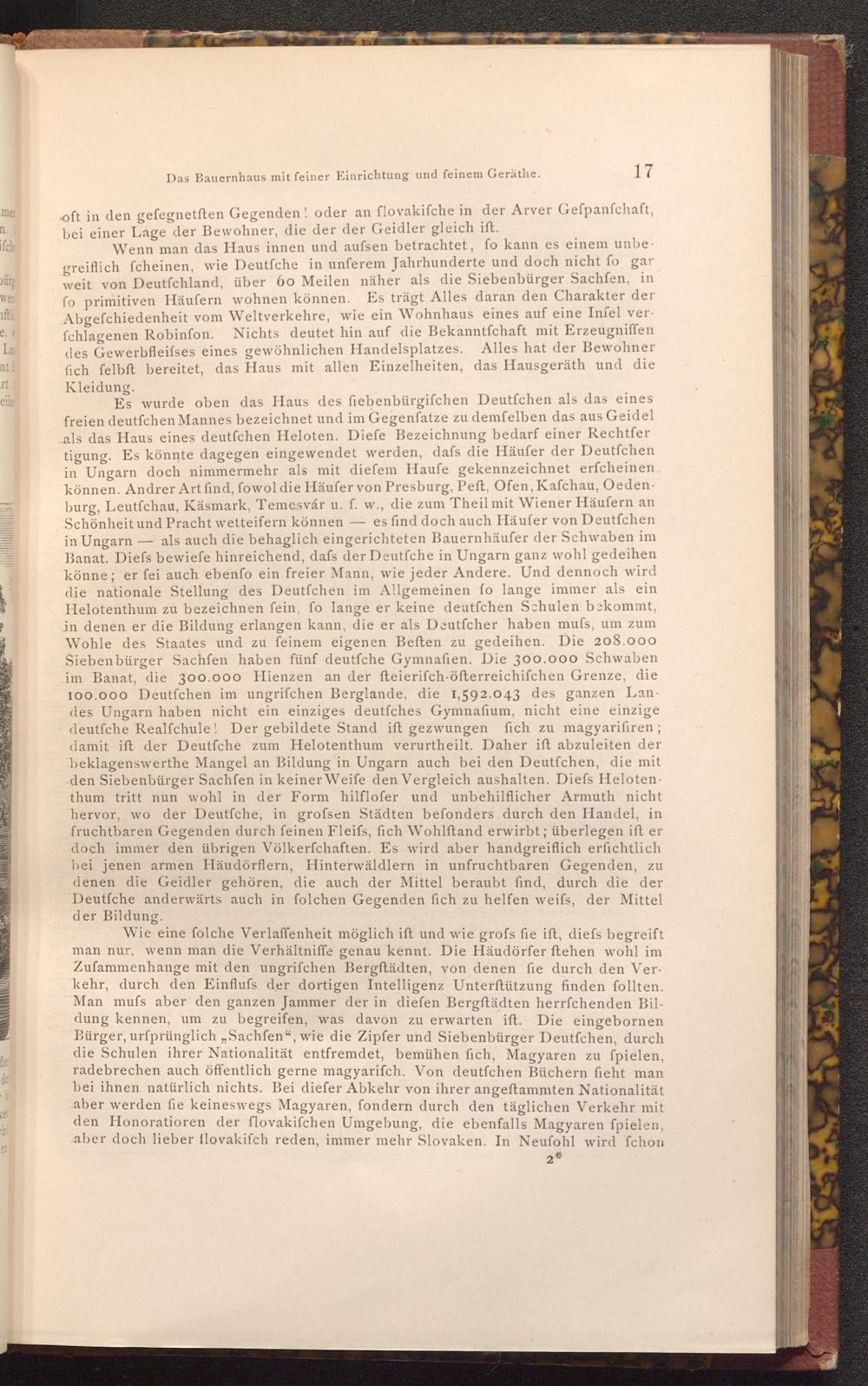 Es wurde oben das Haus des fiebenbürgifchen Deutfchen als das eines freien deutfchen Mannes bezeichnet und im Gegenfatze zu demfelben das aus Geidel als das Haus eines deutſchen Heloten. Diefe Bezeichnung bedarf einer Rechtfer tigung. Es könnte dagegen eingewendet werden, dafs die Häufer der Deutfchen in Ungarn doch nimmermehr als mit diefem Haufe gekennzeichnet erfcheinen. können. Andrer Art find, fowol die Häufer von Presburg, Peft, Ofen, Kafchau, Oedenburg, Leutfchau, Käsmark, Temesvár u. f. w., die zum Theil mit Wiener Häufern an Schönheit und Pracht wetteifern können es find doch auch Häufer von Deutfchen in Ungarn als auch die behaglich eingerichteten Bauernhäufer der Schwaben im Banat. Diefs bewiefe hinreichend, dafs der Deutfche in Ungarn ganz wohl gedeihen könne; er fei auch ebenfo ein freier Mann, wie jeder Andere. Und dennoch wird die nationale Stellung des Deutfchen im Allgemeinen fo lange immer als ein Helotenthum zu bezeichnen fein, fo lange er keine deutfchen Schulen bekommt, in denen er die Bildung erlangen kann, die er als Deutfcher haben mufs, um zum Wohle des Staates und zu feinem eigenen Beften zu gedeihen. Die 208.000 Siebenbürger Sachfen haben fünf deutfche Gymnafien. Die 300.000 Schwaben im Banat, die 300.000 Hienzen an der fteierifch- öfterreichifchen Grenze, die 100.000 Deutfchen im ungrifchen Berglande, die 1,592.043 des ganzen Landes Ungarn haben nicht ein einziges deutfches Gymnafium, nicht eine einzige deutfche Realfchule! Der gebildete Stand ift gezwungen fich zu magyarifiren; damit ift der Deutfche zum Helotenthum verurtheilt. Daher ift abzuleiten der beklagenswerthe Mangel an Bildung in Ungarn auch bei den Deutfchen, die mit den Siebenbürger Sachfen in keiner Weife den Vergleich aushalten. Diefs Helotenthum tritt nun wohl in der Form hilflofer und unbehilflicher Armuth nicht hervor, wo der Deutfche, in grofsen Städten befonders durch den Handel, in fruchtbaren Gegenden durch feinen Fleifs, fich Wohlftand erwirbt; überlegen ift er doch immer den übrigen Völkerfchaften. Es wird aber handgreiflich erfichtlich bei jenen armen Häudörflern, Hinterwäldlern in unfruchtbaren Gegenden, zu denen die Geidler gehören, die auch der Mittel beraubt find, durch die der Deutfche anderwärts auch in folchen Gegenden fich zu helfen weifs, der Mittel der Bildung.