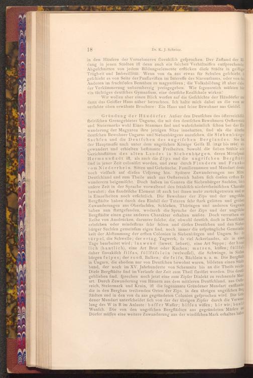 Gründung der Häudörfer. Aufser den Deutfchen des öfterreichifch fteirifchen Grenzgebietes Ungarns, die mit den deutfchen Bewohnern Oefterreichs und Steiermarks wohl Eines Stammes find und wahrfcheinlich fchon bei der Ein wanderung der Magyaren ihre jetzigen Sitze innehatten, find als die älteften deutfchen Bewohner Ungarns und Siebenbürgens anzufehen, die Siebenbürger Sachfen und die Deutfchen des ungrifchen Berglandes. Sie find der Hauptmaffe nach unter dem ungrifchen Könige Geifa II.( 1141 bis 1161) ein gewandert und erhielten beftimmte Freiheiten. Sowohl die fieben Stühle oder Gerichtsftätten des alten Landes in Siebenbürgen, deren Mittelpunkt Hermannftadt ift, als auch die Zips und die ungrifchen Bergftädte find in jener Zeit colonifirt worden, und zwar durch Flandern und Franken vom Niederrhein. Sitten und Gebräuche, Familiennamen und Mundart deutes noch vielfach auf diefen Urfprung hin. Spätere Zuwanderungen aus Mittel Deutfchland und zum Theile auch aus Oefterreich haben fich diefen erften Ein wanderern beigemifcht. Doch haben im Ganzen die Siebenbürger Sachfen, bis i unfere Zeit in der Sprache vorwaltend den fränkifch- niederrheinifchen Charakter bewahrt; das flandrifche Element ift auch bei ihnen mehr zurückgetreten und nur in Einzelheiten noch erfichtlich. Die Bewohner der Zips und der ungrifche Bergftädte haben durch den Einfall der Tataren fehr stark gelitten und gröfsere Zuwanderungen aus Oberfachfen, Schlefien, Thüringen und anderen Gegenden haben nun ftattgefunden, wodurch die Sprache der Zips und der ungrifchen Bergftädte einen ganz anderen Charakter erhalten mufste. Doch verrathen eine Reihe von Ausdrücken, darunter folche, die, obwohl deutfch, doch in Deutſchland erlofchen oder mindeſtens fehr felten und diefen Deutfchen und den Sieben bürger Sachfen gemeinfam eigen find, noch immer die urfprüngliche Gemeinfan keit der Abftammung der erften Colonien in Siebenbürgen und Ungarn. So: der türpel, die Schwelle; der ertag, Tagwerk, fo viel Ackerlandes, als in einem Tage bearbeitet wird; laawend( læwet, læbert), eine Art Suppe; der honk lich( hantlich), eine Art Brot oder Kuchen; matzen, küffen; füllfafs daher flovakifch filfas, föllfäfslein( welweffel), die Schwinge, in Sieben bürgen felpes; der rooft, Balken; die feife, Bächlein u. a. m. Die Bergftädte in Ungarn, die ehedem nur von Deutfchen bewohnt waren, bildeten einen Städte bund, der noch im XV. Jahrhunderte von Schemnitz bis an die Theifs reichte Diefe Bergftädte find im Verlaufe der Zeit zum Theil flavifirt worden. Die deutfch geblieben find, fprechen noch jetzt eine zum Zipfer Dialekt zu rechnende Mundart. Durch Zuwanderung von Häuern aus dem mittleren Deutſchland, aus Oefter reich, Steiermark und Krain, ift die fogenannte Gründener Mundart entstanden die in den Bergbau treibenden Orten der Zips, in den übrigen ungrifchen Berg ftädten und in den von da aus gegründeten Colonien gefprochen wird. Die Grün dener Mundart unterfcheidet fich von der der übrigen Zipfer durch die Verwand lung des W in B im Anlaute: baffer Waffer; biffen wiffen; bir wir; bunfch Wunfch. Die von den ungrifchen Bergftädten aus gegründeten Märkte und Dörfer müffen eine weitere Zuwanderung aus der windifchen Mark erhalten haben.