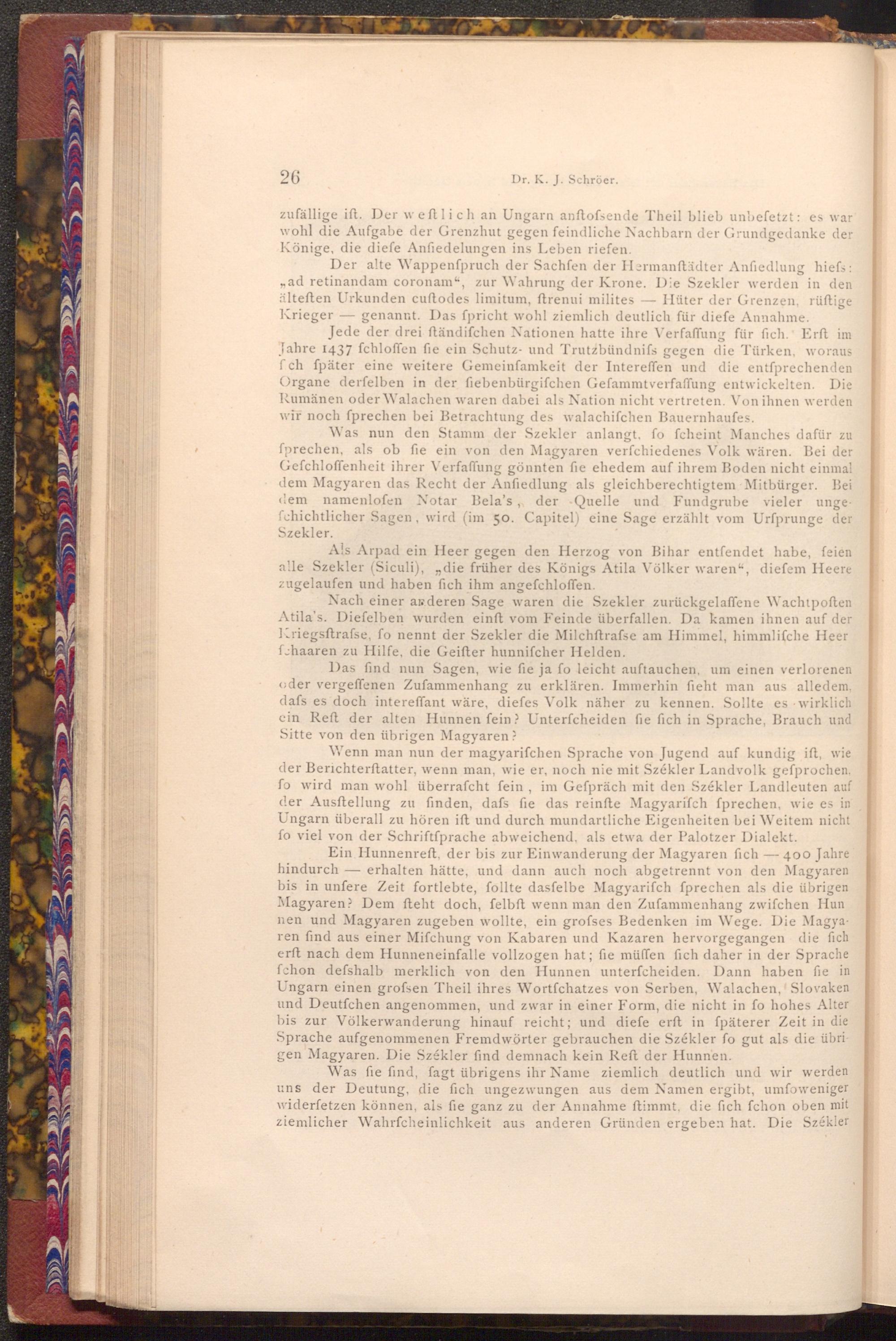 Das find nun Sagen, wie fie ja fo leicht auftauchen, um einen verlorenen oder vergeffenen Zufammenhang zu erklären. Immerhin fieht man aus alledem, dafs es doch intereffant wäre, diefes Volk näher zu kennen. Sollte es wirklich ein Reft der alten Hunnen fein? Unterfcheiden fie fich in Sprache, Brauch und Sitte von den übrigen Magyaren?
