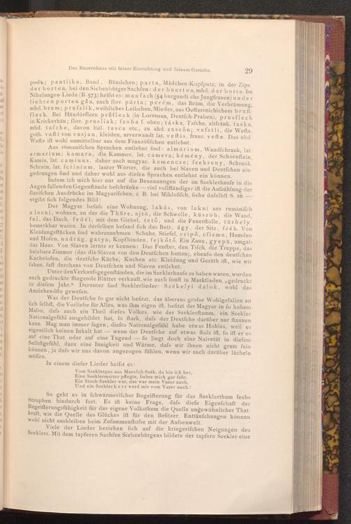 Der Magyar befafs eine Wohnung, lakás, von lakni aus rumänifch a locui, wohnen, an der die Thüre, ajtó, die Schwelle, küszöb, die Wand, fal, das Dach, fedél, mit dem Giebel, tető, und die Feuerftolle, tüzhely, bemerkbar waren. In derfelben befand fich das Bett, ágy, der Sitz, fzék. Von Kleidungsftücken find wahrzunehmen: Schuhe, Stiefel, czipö, cfizma, Hemden und Hofen, nadrág, gatya, Kopfbinden, fejkötő. Ein Zaun, gyepü, umgab das Haus. Von Slaven lernte er kennen: Das Fenfter, den Tifch, die Treppe, das heizbare Zimmer( das die Slaven von den Deutfchen hatten), ebenfo den deutfchen Kachelofen, die deutfche Küche, Kuchen etc. Kleidung und Geräth ift, wie wir fahen, faft durchaus von Deutfchen und Slaven entlehnt.