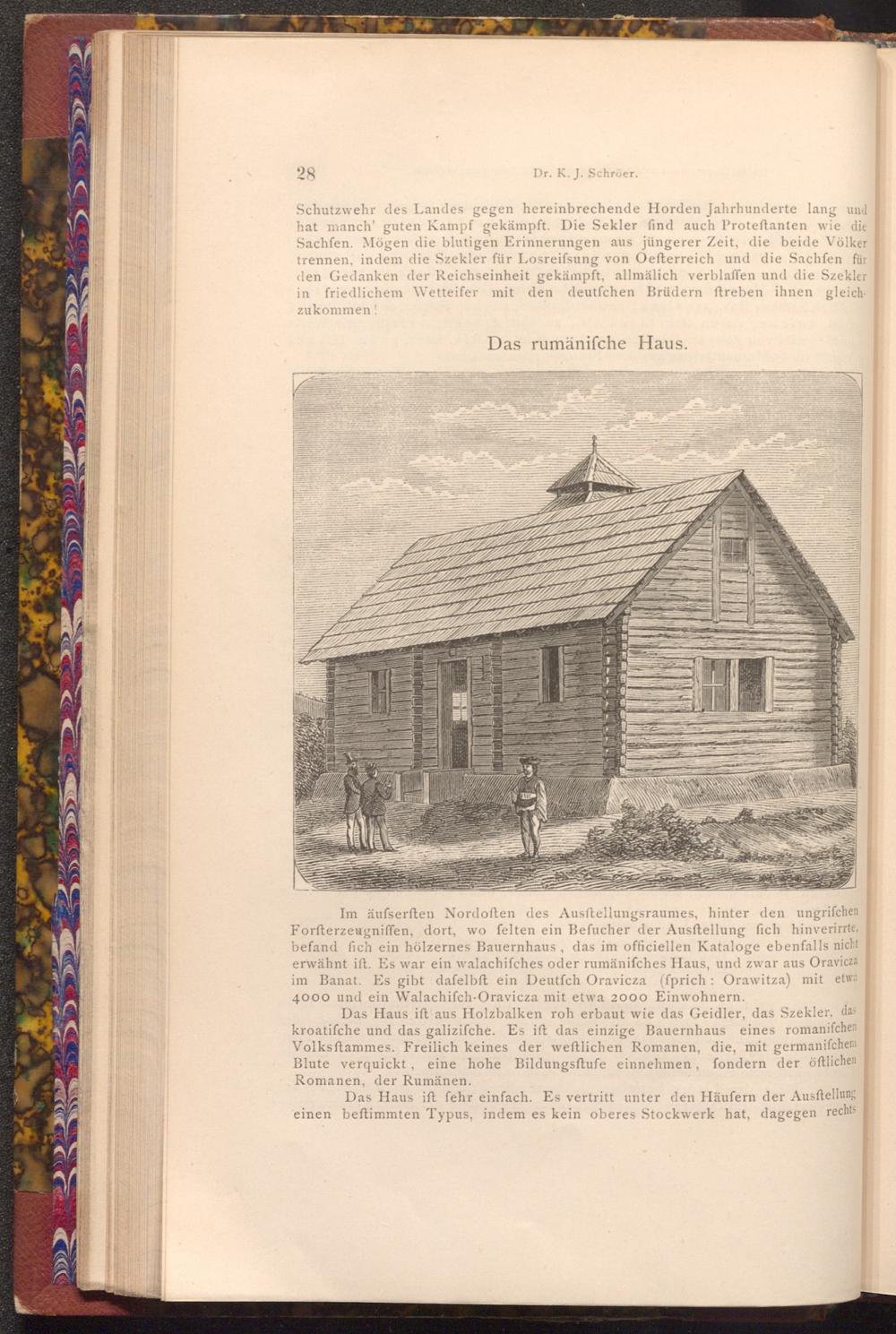 Im äufserften Nordoften des Ausftellungsraumes, hinter den ungrifchen Forfterzeugniffen, dort, wo felten ein Befucher der Ausftellung fich hinverirrte, befand fich ein hölzernes Bauernhaus, das im officiellen Kataloge ebenfalls nicht erwähnt ift. Es war ein walachifches oder rumänifches Haus, und zwar aus Oravicza im Banat. Es gibt dafelbft ein Deutfch Oravicza( fprich: Orawitza) mit etwa 4000 und ein Walachifch- Oravicza mit etwa 2000 Einwohnern.