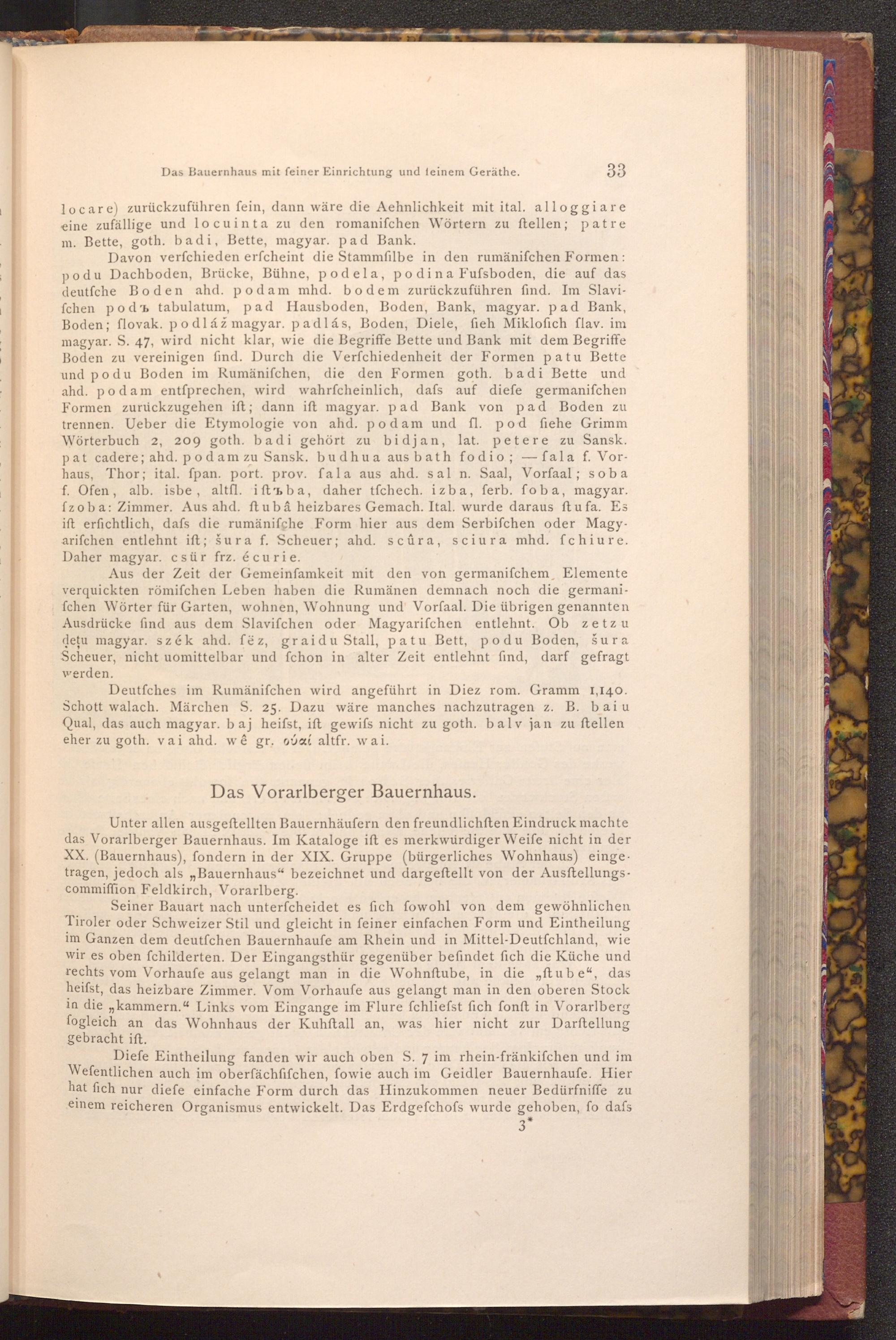 Davon verfchieden erfcheint die Stammfilbe in den rumänifchen Formen: podu Dachboden, Brücke, Bühne, podela, podina Fufsboden, die auf das deutfche Boden ahd. podam mhd. bodem zurückzuführen find. Im Slavifchen pod tabulatum, pad Hausboden, Boden, Bank, magyar. pad Bank, Boden; flovak. podláž magyar. padlás, Boden, Diele, fieh Miklofich flav. im magyar. S. 47, wird nicht klar, wie die Begriffe Bette und Bank mit dem Begriffe Boden zu vereinigen find. Durch die Verfchiedenheit der Formen patu Bette und podu Boden im Rumänifchen, die den Formen goth. badi Bette und ahd. podam entſprechen, wird wahrfcheinlich, dafs auf diefe germanifchen Formen zurückzugehen ift; dann ift magyar. pad Bank von pad Boden zu trennen. Ueber die Etymologie von ahd. podam und fl. pod fiehe Grimm Wörterbuch 2, 209 goth. badi gehört zu bidjan, lat. petere zu Sansk. pat cadere; ahd. podam zu Sansk. budhua aus bath fodio; fala f. Vorhaus, Thor; ital. fpan. port. prov. fala aus ahd. sal n. Saal, Vorfaal; soba f. Ofen, alb. isbe, altfl. iftьba, daher tfchech. izba, ferb. foba, magyar. fzoba: Zimmer. Aus ahd. ftubâ heizbares Gemach. Ital. wurde daraus ftufa. Es ift erfichtlich, dafs die rumänifche Form hier aus dem Serbifchen oder Magyarifchen entlehnt ift; šura f. Scheuer; ahd. scûra, sciura mhd. fchiure. Daher magyar. csür frz. écurie.