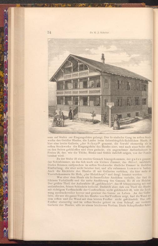 man auf Stufen zur Eingangsthüre gelangt. Der fo einfache Gang im erften Stockwerke des Geidler Haufes, die Laube beim fiebenbürgifch- fächfifchen Haufe, ift hier eine breite Gallerie,„ der Schopf" genannt, die fowohl ebenerdig als im erften Stockwerke die Eingangsfeite des Haufes ziert, und nach einer Seite offen, an den Seiten gefchloffen und oben gedeckt, ein angenehmer Aufenthaltsort im Freien ift, der, wie die Tifche, Bänke und Stühle dafelbft zeigen, von der Familie benützt wird.