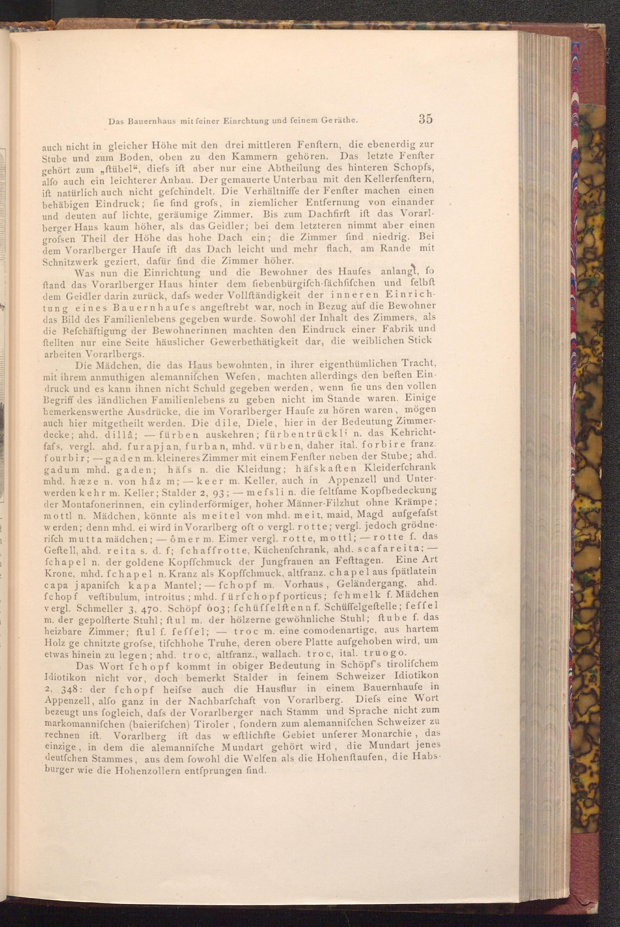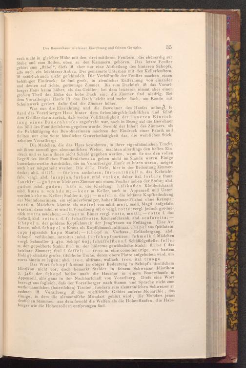 Das Wort fchopf kommt in obiger Bedeutung in Schöpf's tirolifchem Idiotikon nicht vor, doch bemerkt Stalder in feinem Schweizer Idiotikon 2, 348: der fchopf heifse auch die Hausflur in einem Bauernhaufe in Appenzell, alfo ganz in der Nachbarfchaft von Vorarlberg. Diefs eine Wort bezeugt uns fogleich, dafs der Vorarlberger nach Stamm und Sprache nicht zum markomannifchen( baierifchen) Tiroler, fondern zum alemannifchen Schweizer zu rechnen ift. Vorarlberg ift das w eftlichfte Gebiet unferer Monarchie, das einzige, in dem die alemannifche Mundart gehört wird, die Mundart jenes deutfchen Stammes, aus dem fowohl die Welfen als die Hohenftaufen, die Habsburger wie die Hohenzollern entfprungen find.