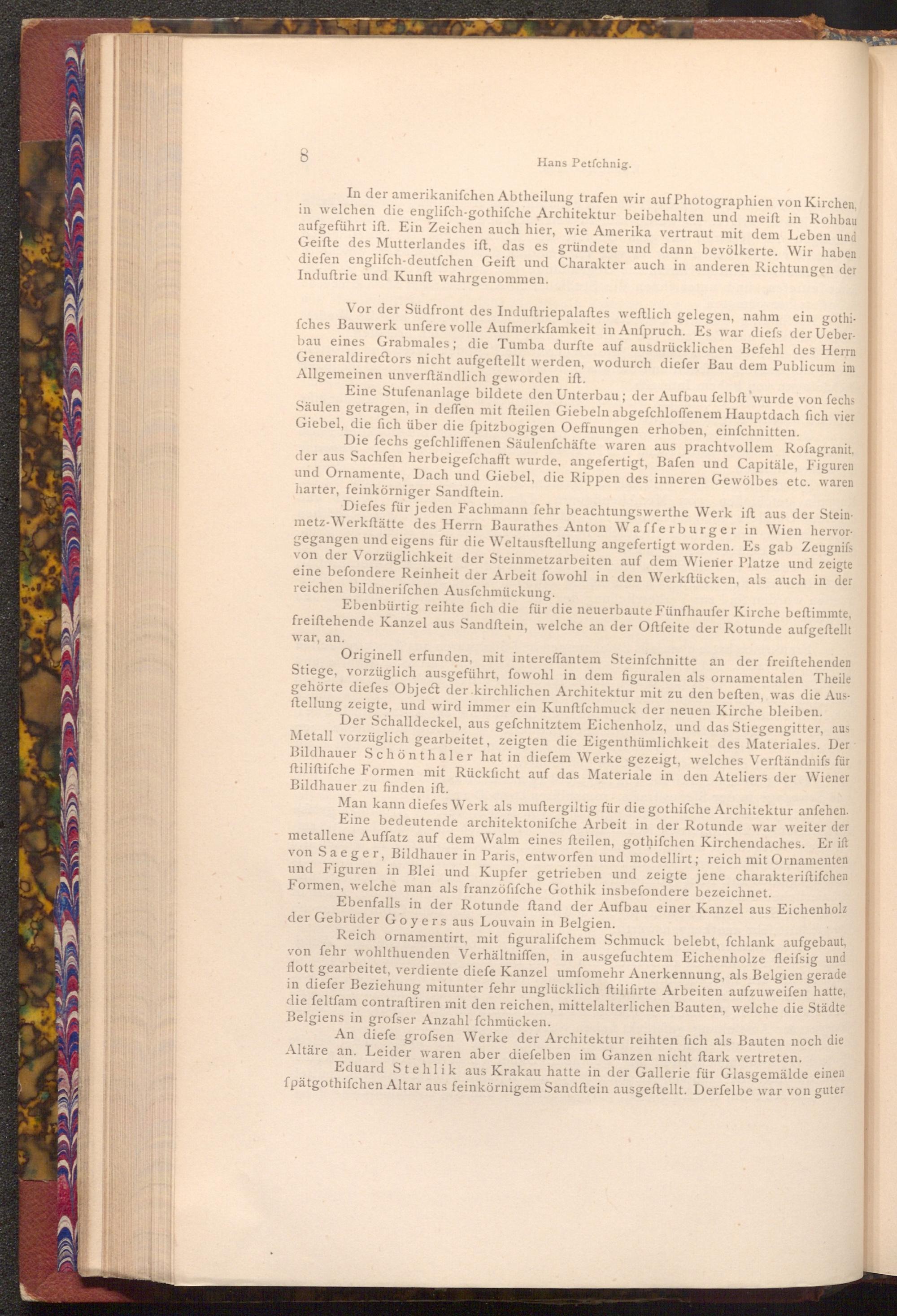Diefes für jeden Fachmann fehr beachtungswerthe Werk ift aus der Steinmetz- Werkstätte des Herrn Baurathes Anton Wafferburger in Wien hervor gegangen und eigens für die Weltausftellung angefertigt worden. Es gab Zeugniss von der Vorzüglichkeit der Steinmetzarbeiten auf dem Wiener Platze und zeigte eine befondere Reinheit der Arbeit fowohl in den Werkstücken, als auch in der reichen bildnerifchen Ausfchmückung.