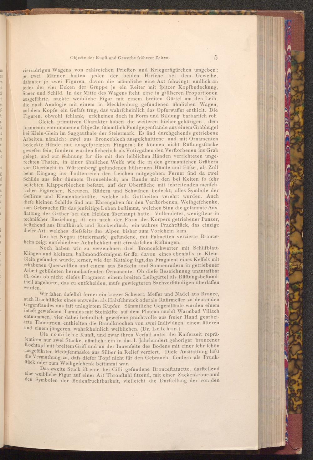 vierrädrigen Wagens von zahlreichen Priefter- und Kriegerfigürchen umgeben; je zwei Männer halten jeden der beiden Hirſche bei dem Geweihe, dahinter je zwei Figuren, davon die männliche eine Axt fchwingt, endlich an jeder der vier Ecken der Gruppe je ein Reiter mit fpitzer Kopfbedeckung, Speer und Schild. In der Mitte des Wagens fteht eine in gröfseren Proportionen ausgeführte, nackte weibliche Figur mit einem breiten Gürtel um den Leib, die nach Analogie mit einem in Mecklenburg gefundenen ähnlichen Wagen, auf dem Kopfe ein Gefäfs trug, das wahrscheinlich das Opferwaffer enthielt. Die Figuren, obwohl fchlank, erfcheinen doch in Form und Bildung barbarifch roh. Gleich primitiven Charakter haben die weiteren hieher gehörigen, dem Joanneum entnommenen Objecte, fämmtlich Fundgegenftände aus einem Grabhügel bei Klein- Glein im Saggauthale der Steiermark. Es find durchgehends getriebene Arbeiten, nämlich: zwei aus Bronceblech ausgefchnittene und mit Ornamenten bedeckte Hände mit ausgefpreizten Fingern; fie können nicht Rüftungsstücke gewefen fein, fondern wurden ficherlich als Votivgaben den Verftorbenen ins Grab gelegt, und zur Sühnung für die mit den leiblichen Händen verrichteten ungerechten Thaten, in einer ähnlichen Weife wie die in den germanifchen Gräbern von Oberflacht in Würtemberg gefundenen hölzernen Hände und Füfse, als Zoll beim Eingang ins Todtenreich den Leichen mitgegeben. Ferner find da zwei Schilde aus fehr dünnem Bronceblech, am Rande mit den bei Kelten fo fehr beliebten Klapperblechen befetzt, auf der Oberfläche mit fchreitenden menfchlichen Figürchen, Kreuzen, Rädern und Schwänen bedeckt, alles Symbole der Geftirne und Elementarkräfte, welche als Gottheiten verehrt wurden. Auch diefe kleinen Schilde find nur Ehrengaben für den Verftorbenen, Weihgefchenke, zum Gebrauche für das jenfeitige Leben beftimmt, welchen Sinn die gefammte Aus ftattung der Gräber bei den Heiden überhaupt hatte. Vollendeter, wenigftens in technifcher Beziehung, ift ein nach der Form des Körpers getriebener Panzer, beftehend aus Bruftkürafs und Rückenftück, ein wahres Prachtftück, das einzige diefer Art, welches diefsfeits der Alpen bisher zum Vorfchein kam.
