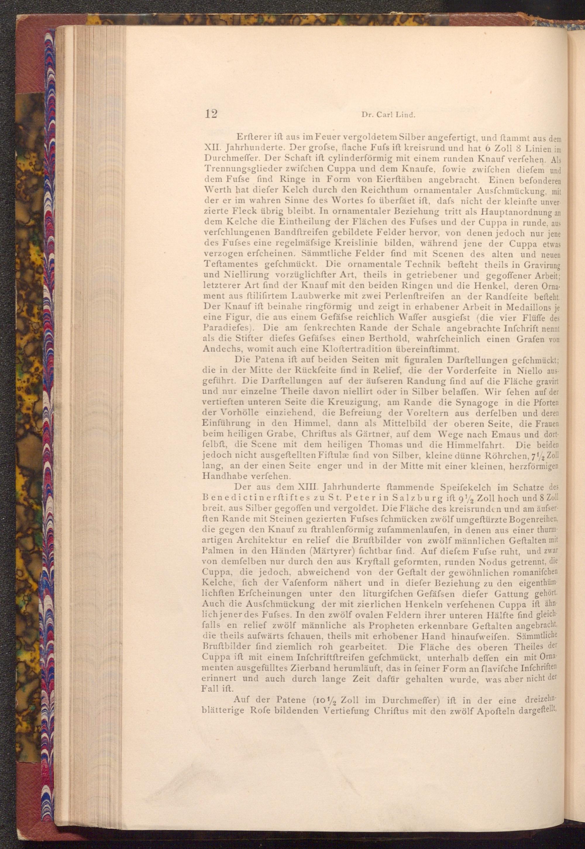 Erfterer ift aus im Feuer vergoldetem Silber angefertigt, und ſtammt aus dem XII. Jahrhunderte. Der grofse, flache Fufs ift kreisrund und hat 6 Zoll 8 Linien im Durchmeffer. Der Schaft ift cylinderförmig mit einem runden Knauf verfehen. Als Trennungsglieder zwifchen Cuppa und dem Knaufe, fowie zwifchen diefem und dem Fufse find Ringe in Form von Eierftäben angebracht. Einen befonderen Werth hat diefer Kelch durch den Reichthum ornamentaler Ausfchmückung, mit der er im wahren Sinne des Wortes fo überfäet ift, dafs nicht der kleinfte unverzierte Fleck übrig bleibt. In ornamentaler Beziehung tritt als Hauptanordnung an dem Kelche die Eintheilung der Flächen des Fufses und der Cuppa in runde, aus verfchlungenen Bandftreifen gebildete Felder hervor, von denen jedoch nur jene des Fufses eine regelmäfsige Kreislinie bilden, während jene der Cuppa etwas verzogen erfcheinen. Sämmtliche Felder find mit Scenen des alten und neuen Teftamentes gefchmückt. Die ornamentale Technik befteht theils in Gravirung und Niellirung vorzüglichfter Art, theils in getriebener und gegoffener Arbeit; letzterer Art find der Knauf mit den beiden Ringen und die Henkel, deren Ornament aus ftilifirtem Laubwerke mit zwei Perlenftreifen an der Randfeite befteht. Der Knauf ift beinahe ringförmig und zeigt in erhabener Arbeit in Medaillons je eine Figur, die aus einem Gefäfse reichlich Waffer ausgiefst( die vier Flüffe des Paradiefes). Die am fenkrechten Rande der Schale angebrachte Infchrift nennt als die Stifter diefes Gefäfses einen Berthold, wahrfcheinlich einen Grafen von Andechs, womit auch eine Kloftertradition übereinstimmt.