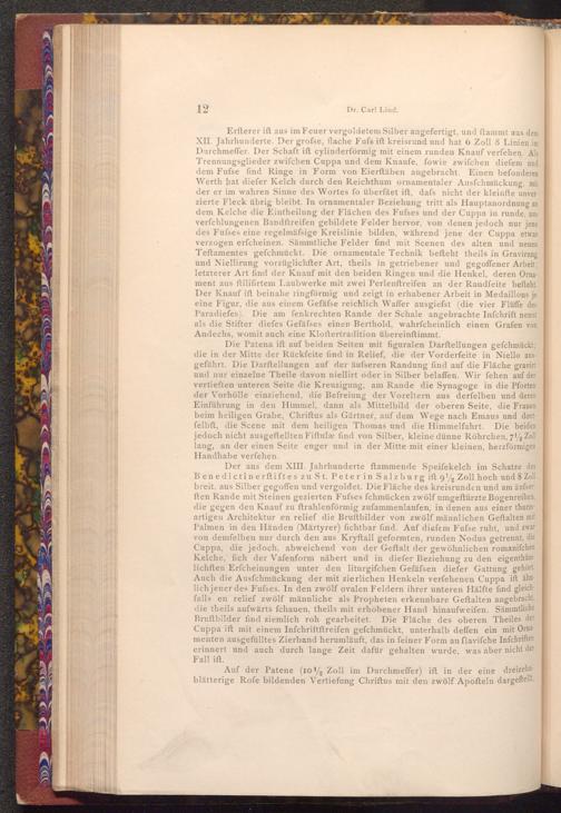 Der aus dem XIII. Jahrhunderte ftammende Speifekelch im Schatze des Benedictinerftiftes zu St. Peterin Salzburg ift 9½ Zoll hoch und 8 Zoll breit, aus Silber gegoffen und vergoldet. Die Fläche des kreisrunden und am äufserften Rande mit Steinen gezierten Fufses fchmücken zwölf umgeftürzte Bogenreihen, die gegen den Knauf zu ftrahlenförmig zufammenlaufen, in denen aus einer thurm artigen Architektur en relief die Bruftbilder von zwölf männlichen Geſtalten mit Palmen in den Händen( Märtyrer) fichtbar find. Auf diefem Fufse ruht, und zwar von demfelben nur durch den aus Kryftall geformten, runden Nodus getrennt, die Cuppa, die jedoch, abweichend von der Geftalt der gewöhnlichen romanifchen Kelche, fich der Vafenform nähert und in diefer Beziehung zu den eigenthüm lichften Erfcheinungen unter den liturgifchen Gefäfsen diefer Gattung gehört. Auch die Ausfchmückung der mit zierlichen Henkeln verfehenen Cuppa ift ähn lich jener des Fufses. In den zwölf ovalen Feldern ihrer unteren Hälfte find gleichfalls en relief zwölf männliche als Propheten erkennbare Geftalten angebracht, die theils aufwärts fchauen, theils mit erhobener Hand hinaufweifen. Sämmtliche Bruftbilder find ziemlich roh gearbeitet. Die Fläche des oberen Theiles der Cuppa ift mit einem Infchriftftreifen gefchmückt, unterhalb deffen ein mit Orna menten ausgefülltes Zierband herumläuft, das in feiner Form an flavifche Infchriften erinnert und auch durch lange Zeit dafür gehalten wurde, was aber nicht der