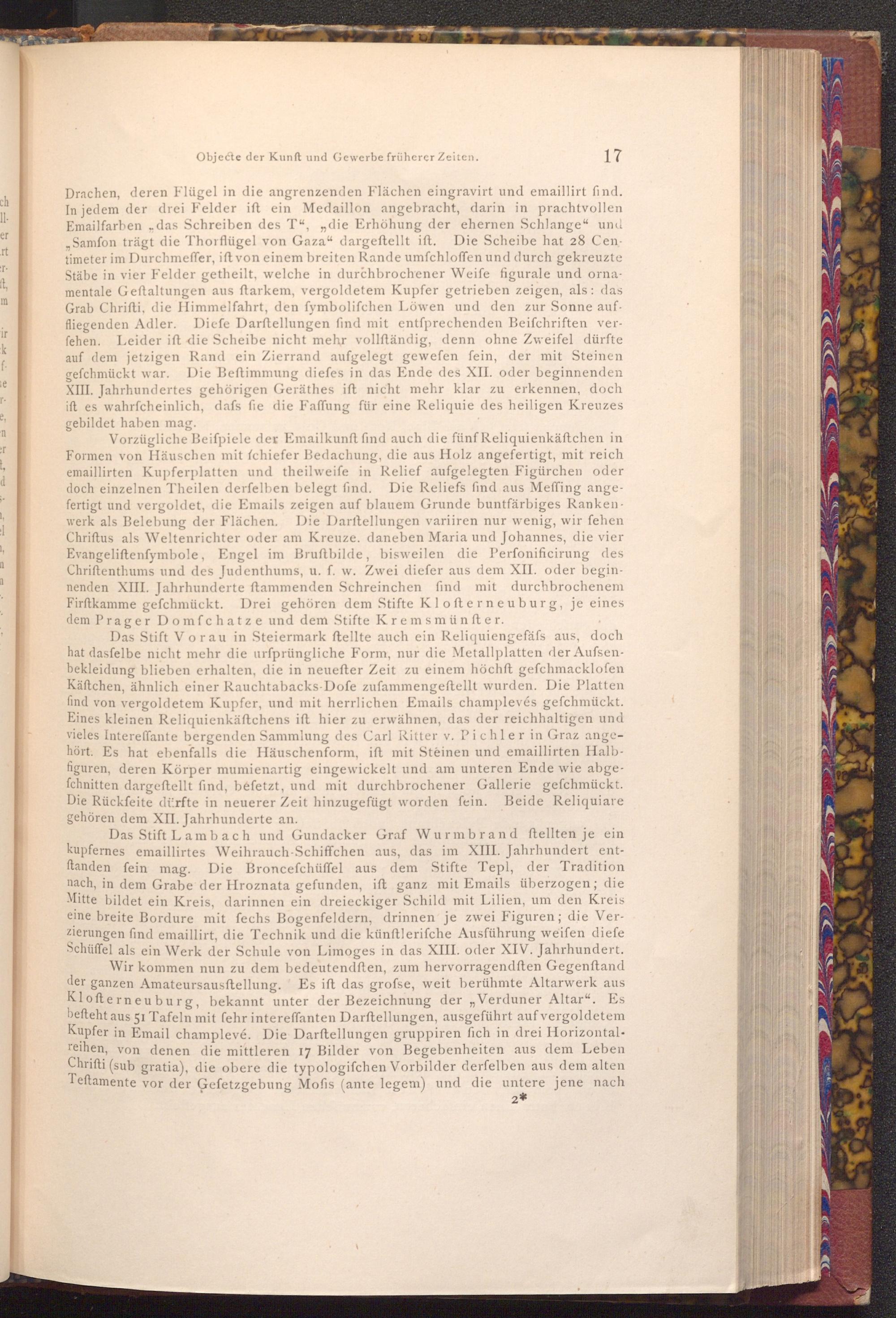 17 Drachen, deren Flügel in die angrenzenden Flächen eingravirt und emaillirt find. In jedem der drei Felder ift ein Medaillon angebracht, darin in prachtvollen Emailfarben, das Schreiben des T"," die Erhöhung der ehernen Schlange" und Samfon trägt die Thorflügel von Gaza" dargestellt ift. Die Scheibe hat 28 Centimeter im Durchmeffer, ift von einem breiten Rande umfchloffen und durch gekreuzte Stäbe in vier Felder getheilt, welche in durchbrochener Weife figurale und ornamentale Geftaltungen aus ftarkem, vergoldetem Kupfer getrieben zeigen, als: das Grab Chrifti, die Himmelfahrt, den fymbolifchen Löwen und den zur Sonne auffliegenden Adler. Diefe Darftellungen find mit entsprechenden Beifchriften verfehen. Leider ift die Scheibe nicht mehr vollständig, denn ohne Zweifel dürfte auf dem jetzigen Rand ein Zierrand aufgelegt gewefen fein, der mit Steinen gefchmückt war. Die Beftimmung diefes in das Ende des XII. oder beginnenden XIII. Jahrhundertes gehörigen Geräthes ift nicht mehr klar zu erkennen, doch ift es wahrfcheinlich, dafs fie die Faffung für eine Reliquie des heiligen Kreuzes gebildet haben mag.
