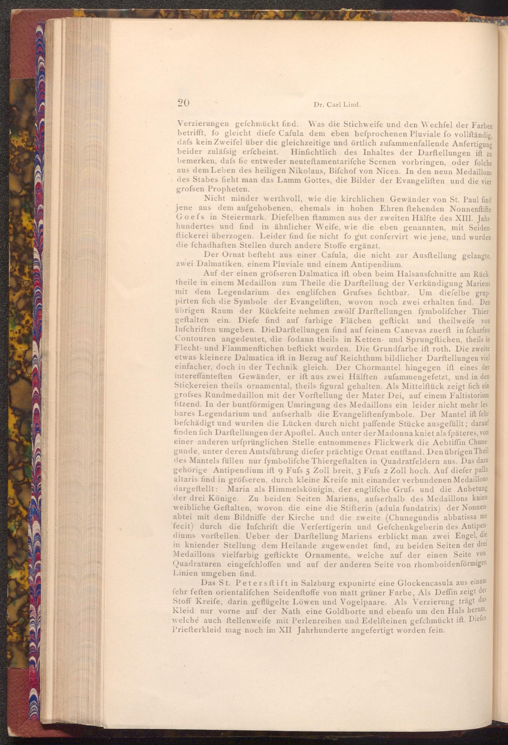 Das St. Peters ftift in Salzburg exponirte eine Glockencasula aus einem fehr feften orientalifchen Seidenftoffe von matt grüner Farbe, Als Deffin zeigt der Stoff Kreife, darin geflügelte Löwen und Vogelpaare. Als Verzierung trägt das Kleid nur vorne auf der Nath eine Goldborte und ebenfo um den Hals herum, welche auch ftellenweife mit Perlenreihen und Edelſteinen gefchmückt ift. Diefes Priefterkleid mag noch im XII Jahrhunderte angefertigt worden fein.