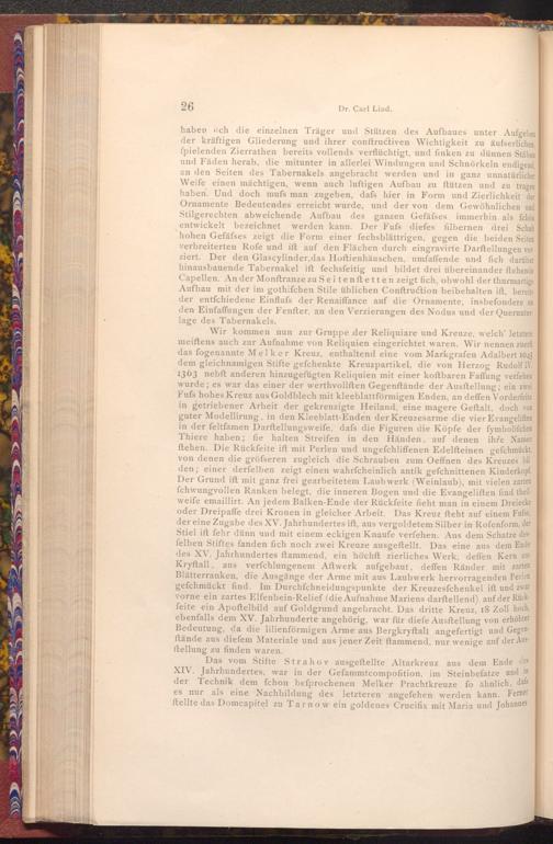 Das vom Stifte Strahov ausgeftellte Altarkreuz aus dem Ende des XIV. Jahrhundertes, war in der Gefammt compofition, im Steinbefatze und in der Technik dem fchon befprochenen Melker Prachtkreuze fo ähnlich, dafs es nur als eine Nachbildung des letzteren angefehen werden kann. Ferner ftellte das Domcapitel zu Tarnow ein goldenes Crucifix mit Maria und Johannes