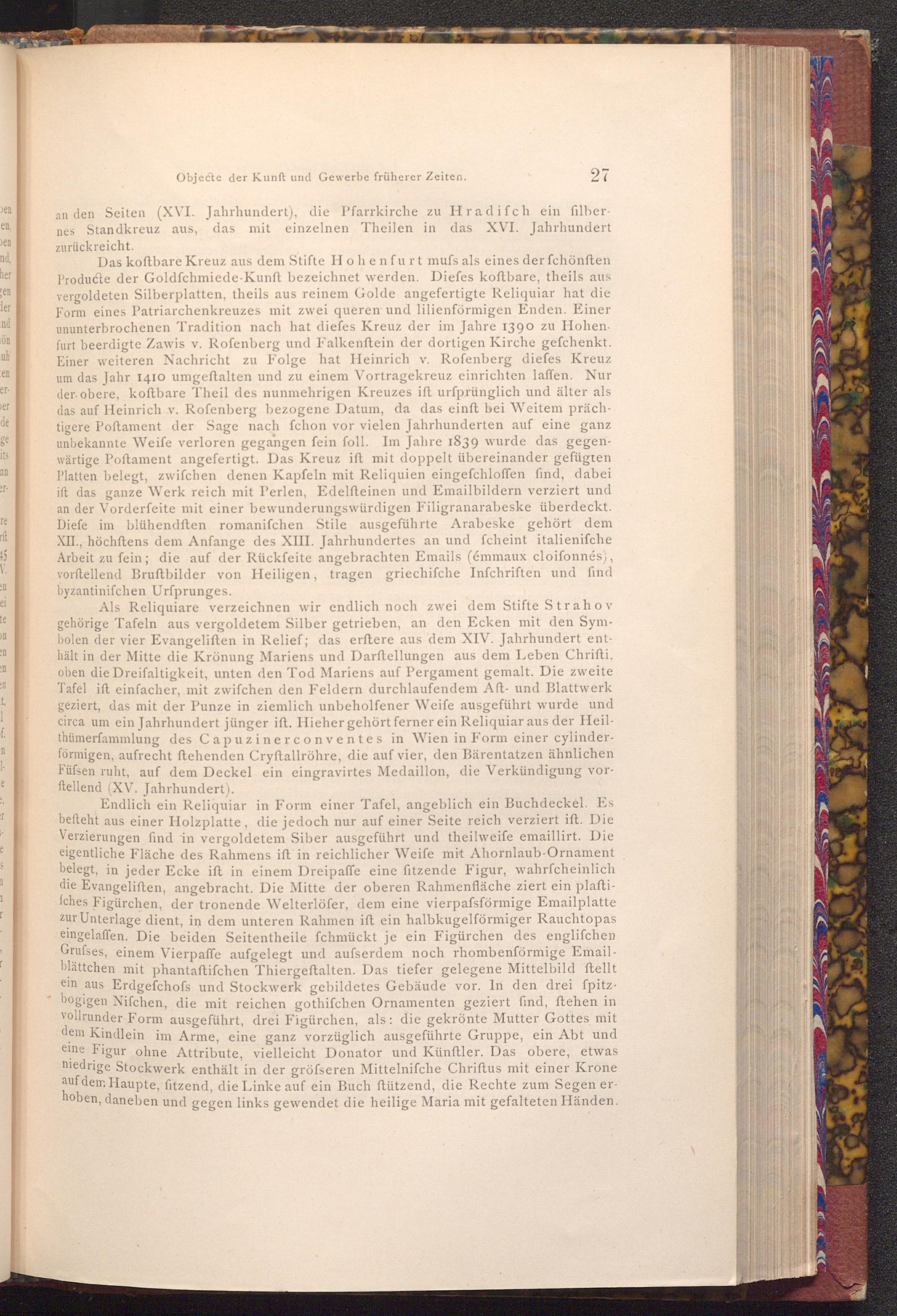 Das koftbare Kreuz aus dem Stifte Hohenfurt mufs als eines der fchönften Producte der Goldfchmiede- Kunft bezeichnet werden. Diefes koftbare, theils aus vergoldeten Silberplatten, theils aus reinem Golde angefertigte Reliquiar hat die Form eines Patriarchenkreuzes mit zwei queren und lilienförmigen Enden. Einer ununterbrochenen Tradition nach hat diefes Kreuz der im Jahre 1390 zu Hohenfurt beerdigte Zawis v. Rofenberg und Falkenftein der dortigen Kirche gefchenkt. Einer weiteren Nachricht zu Folge hat Heinrich v. Rofenberg diefes Kreuz um das Jahr 1410 umgeftalten und zu einem Vortragekreuz einrichten laffen. Nur der obere, koftbare Theil des nunmehrigen Kreuzes ift urfprünglich und älter als das auf Heinrich v. Rofenberg bezogene Datum, da das einft bei Weitem prächtigere Poftament der Sage nach fchon vor vielen Jahrhunderten auf eine ganz unbekannte Weife verloren gegangen fein foll. Im Jahre 1839 wurde das gegenwärtige Poftament angefertigt. Das Kreuz ift mit doppelt übereinander gefügten Platten belegt, zwifchen denen Kapfeln mit Reliquien eingefchloffen find, dabei ift das ganze Werk reich mit Perlen, Edelfteinen und Emailbildern verziert und an der Vorderseite mit einer bewunderungswürdigen Filigranarabeske überdeckt. Diefe im blühendften romanifchen Stile ausgeführte Arabeske gehört dem XII., höchftens dem Anfange des XIII. Jahrhundertes an und fcheint italienifche Arbeit zu fein; die auf der Rückfeite angebrachten Emails( émmaux cloifonnés), vorftellend Bruftbilder von Heiligen, tragen griechifche Infchriften und find byzantinifchen Urfprunges.