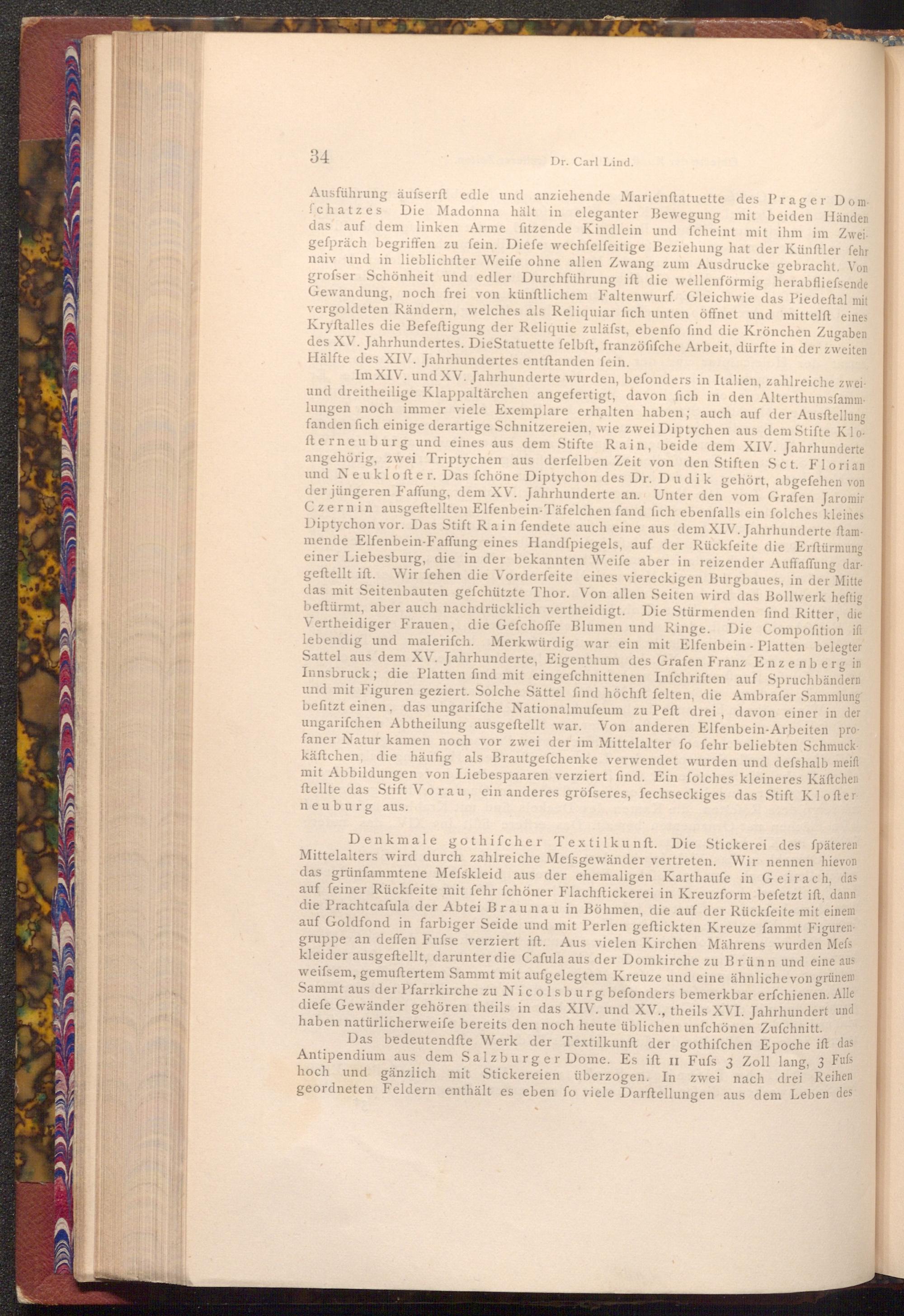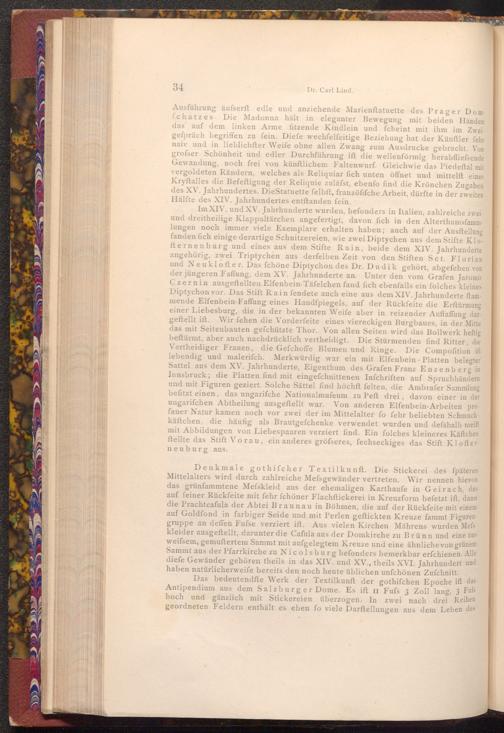 Denkmale gothifcher Textilkunft. Die Stickerei des fpäteren Mittelalters wird durch zahlreiche Mefsgewänder vertreten. Wir nennen hievon das grünfammtene Mefskleid aus der ehemaligen Karthaufe in Geirach, das auf feiner Rückfeite mit fehr fchöner Flachftickerei in Kreuzform befetzt ift, dann die Prachtcafula der Abtei Braunau in Böhmen, die auf der Rückfeite mit einem auf Goldfond in farbiger Seide und mit Perlen geftickten Kreuze fammt Figurengruppe an deffen Fufse verziert ift. Aus vielen Kirchen Mährens wurden Mefs kleider ausgeftellt, darunter die Cafula aus der Domkirche zu Brünn und eine aus weifsem, gemustertem Sammt mit aufgelegtem Kreuze und eine ähnliche von grünem Sammt aus der Pfarrkirche zu Nicolsburg befonders bemerkbar erfchienen. Alle diefe Gewänder gehören theils in das XIV. und XV., theils XVI. Jahrhundert und haben natürlicherweife bereits den noch heute üblichen unfchönen Zuſchnitt.