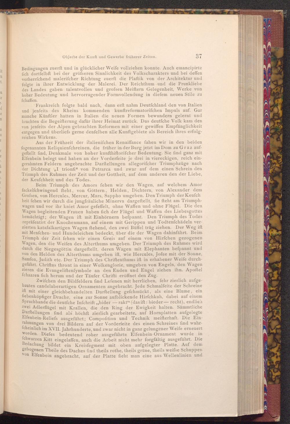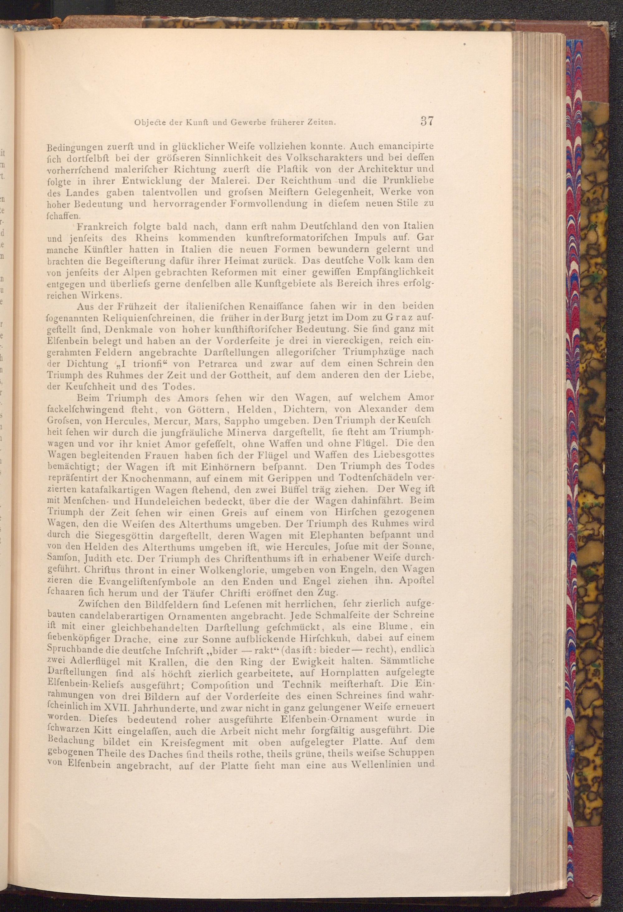 Aus der Frühzeit der italienifchen Renaiffance fahen wir in den beiden fogenannten Reliquienfchreinen, die früher in der Burg jetzt im Dom zu Graz aufgeftellt find, Denkmale von hoher kunfthiftorifcher Bedeutung. Sie find ganz mit Elfenbein belegt und haben an der Vorderfeite je drei in viereckigen, reich eingerahmten Feldern angebrachte Darftellungen allegorifcher Triumphzüge nach der Dichtung" I trionfi" von Petrarca und zwar auf dem einen Schrein den Triumph des Ruhmes der Zeit und der Gottheit, auf dem anderen den der Liebe, der Keufchheit und des Todes.