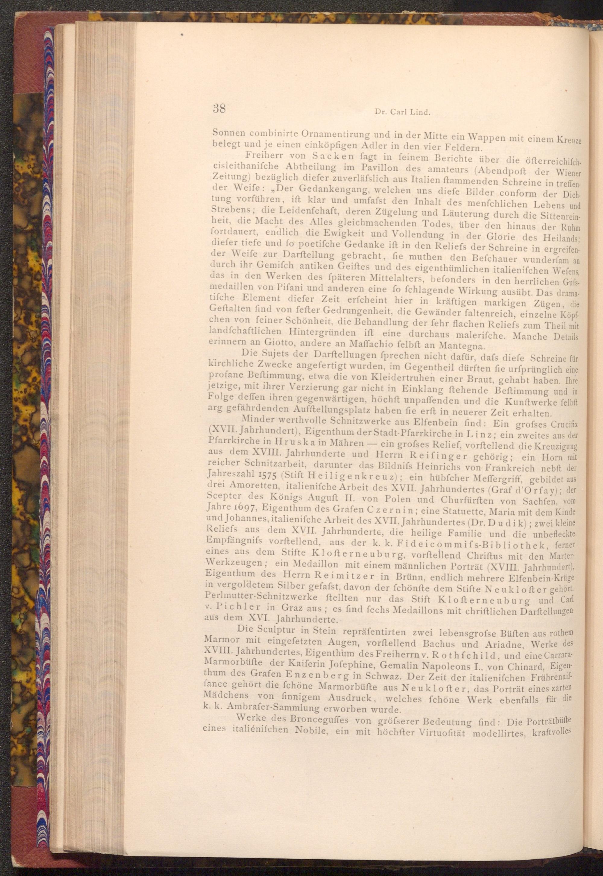 Minder werthvolle Schnitzwerke aus Elfenbein find: Ein grofses Crucifix ( XVII. Jahrhundert), Eigenthum der Stadt- Pfarrkirche in Linz; ein zweites aus der Pfarrkirche in Hruska in Mähren ein grofses Relief, vorftellend die Kreuzigung aus dem XVIII. Jahrhunderte und Herrn Reifinger gehörig; ein Horn mit reicher Schnitzarbeit, darunter das Bildnifs Heinrichs von Frankreich nebft der Jahreszahl 1575( Stift Heiligenkreuz); ein hübfcher Meffergriff, gebildet aus drei Amoretten, italienifche Arbeit des XVII. Jahrhundertes( Graf d'Orfay); der Scepter des Königs Auguft II. von Polen und Churfürften von Sachfen, vom Jahre 1697, Eigenthum des Grafen Czernin; eine Statuette, Maria mit dem Kinde und Johannes, italienifche Arbeit des XVII. Jahrhundertes( Dr. Dudik); zwei kleine Reliefs aus dem XVII. Jahrhunderte, die heilige Familie und die unbefleckte Empfängnifs vorftellend, aus der k. k. Fideicommifs- Bibliothek, ferner eines aus dem Stifte Klofterneuburg, vorftellend Chriftus mit den MarterWerkzeugen; ein Medaillon mit einem männlichen Porträt( XVIII. Jahrhundert), Eigenthum des Herrn Reimitzer in Brünn, endlich mehrere Elfenbein- Krüge in vergoldetem Silber gefafst, davon der fchönfte dem Stifte Neuklofter gehört. Perlmutter- Schnitzwerke ftellten nur das Stift Klofterneuburg