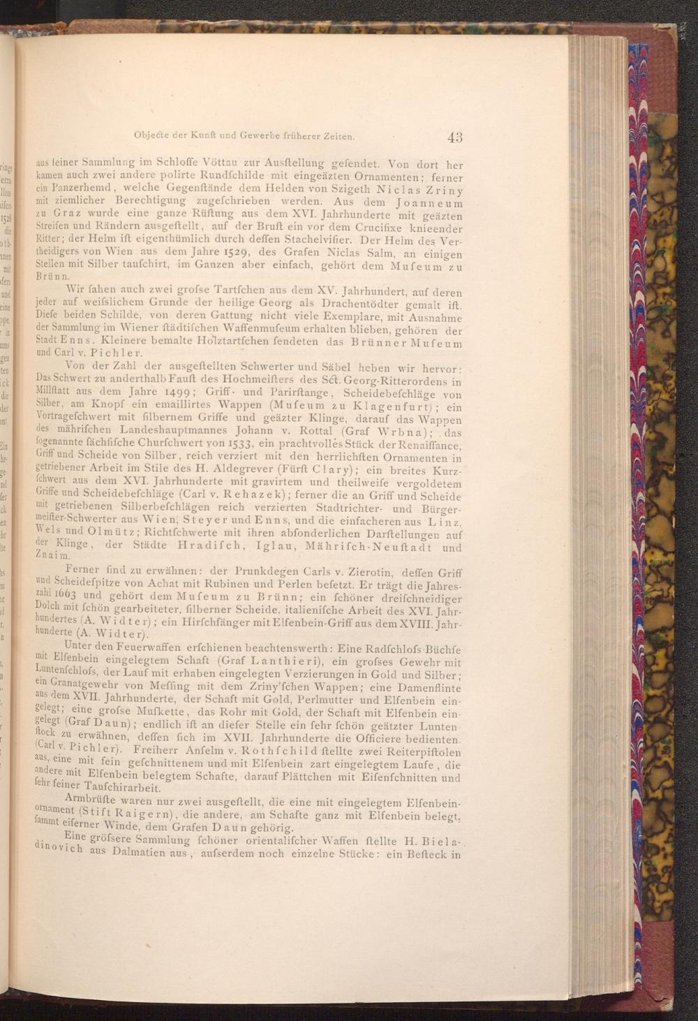 aus feiner Sammlung im Schloffe Vöttau zur Ausftellung gefendet. Von dort her kamen auch zwei andere polirte Rundfchilde mit eingeäzten Ornamenten; ferner ein Panzerhemd, welche Gegenftände dem Helden von Szigeth Niclas Zriny mit ziemlicher Berechtigung zugefchrieben werden. Aus dem Joanneum zu Graz wurde eine ganze Rüftung aus dem XVI. Jahrhunderte mit geäzten Streifen und Rändern ausgeftellt, auf der Bruft ein vor dem Crucifixe knieender Ritter; der Helm ift eigenthümlich durch deffen Stachelvifier. Der Helm des Vertheidigers von Wien aus dem Jahre 1529, des Grafen Niclas Salm, an einigen Stellen mit Silber taufchirt, im Ganzen aber einfach, gehört dem Mufeum zu Brünn.