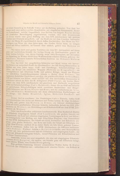 Ferner find zu erwähnen: der Prunkdegen Carls v. Zierotin, deffen Griff und Scheidefpitze von Achat mit Rubinen und Perlen befetzt. Er trägt die Jahreszahl 1663 und gehört dem Mufeum zu Brünn; ein fchöner dreifchneidiger Dolch mit fchön gearbeiteter, filberner Scheide, italienifche Arbeit des XVI. Jahrhundertes( A. Widter); ein Hirfchfänger mit Elfenbein- Griff aus dem XVIII. Jahrhunderte( A. Widter).