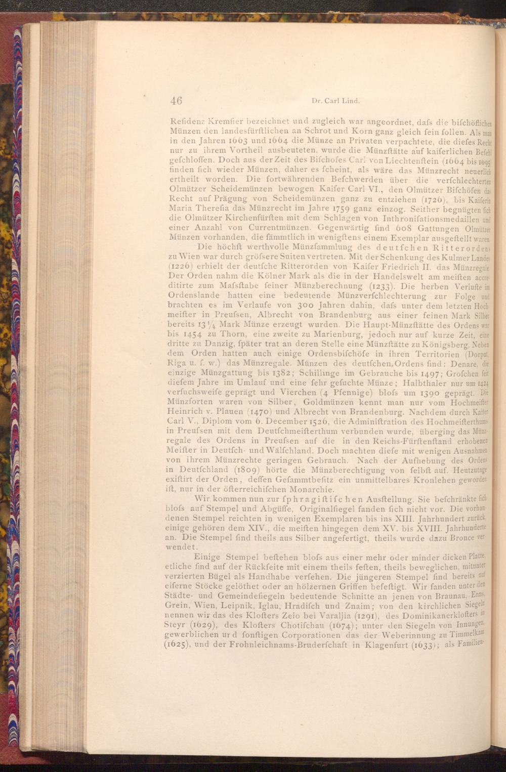Refidenz Kremfier bezeichnet und zugleich war angeordnet, dafs die bifchöflichen Münzen den landesfürftlichen an Schrot und Korn ganz gleich fein follen. Als man in den Jahren 1663 und 1664 die Münze an Privaten verpachtete, die diefes Recht nur zu ihrem Vortheil ausbeuteten, wurde die Münzftätte auf kaiferlichen Befehl gefchloffen. Doch aus der Zeit des Bifchofes Carl von Liechtenſtein( 1664 bis 1695) finden fich wieder Münzen, daher es fcheint, als wäre das Münzrecht neuerlich ertheilt worden. Die fortwährenden Befchwerden über die verfchlechterten Olmützer Scheidemünzen bewogen Kaifer Carl VI., den Olmützer Bifchöfen das Recht auf Prägung von Scheidemünzen ganz zu entziehen( 1726), bis Kaiferin Maria Therefia das Münzrecht im Jahre 1759 ganz einzog. Seither begnügten fich die Olmützer Kirchenfürften mit dem Schlagen von Inthronifationsmedaillen und einer Anzahl von Currentmünzen. Gegenwärtig find 608 Gattungen Olmützer Münzen vorhanden, die fämmtlich in wenigftens einem Exemplar ausgeftellt waren. Die höchft werthvolle Münzfammlung des deutfchen Ritterordens zu Wien war durch gröfsere Suiten vertreten. Mit der Schenkung des Kulmer Landes ( 1226) erhielt der deutfche Ritterorden von Kaifer Friedrich II. das Münzregale Der Orden nahm die Kölner Mark als die in der Handelswelt am meiften accre ditirte zum Mafsftabe feiner Münzberechnung( 1233). Die herben Veriufte im Ordenslande hatten eine bedeutende Münzverfchlechterung zur Folge und brachten es im Verlaufe von 300 Jahren dahin, dafs unter dem letzten Hochmeifter in Preufsen, Albrecht von Brandenburg aus einer feinen Mark Silber bereits 13 Mark Münze erzeugt wurden. Die Haupt- Münzftätte des Ordens war bis 1454 zu Thorn, eine zweite zu Marienburg, jedoch nur auf kurze Zeit, eine dritte zu Danzig, fpäter trat an deren Stelle eine Münzftätte zu Königsberg, Neben dem Orden hatten auch einige Ordensbifchöfe in ihren Territorien( Dorpat, Riga u. f. w.) das Münzregale. Münzen des deutfchen, Ordens find: Denare, die einzige Münzgattung bis 1382; Schillinge im Gebrauche bis 1497; Grofchen feit diefem Jahre im Umlauf und eine fehr gefuchte Münze; Halbthaler nur um 1424 verfuchsweife geprägt und Vierchen( 4 Pfennige) blofs um 1390 geprägt. Die Münzforten waren von Silber, Goldmünzen kennt man nur vom Hochmeifter Heinrich v. Plauen( 1470) und Albrecht von Brandenburg. Nachdem durch Kailer Carl V., Diplom vom 6. December 1526, die Adminiftration des Hochmeifterthums in Preufsen mit dem Deutfchmeifterthum verbunden wurde, überging das Münzregale des Ordens in Preufsen auf die in den Reichs- Fürftenftand erhobenen Meifter in Deutfch- und Wälfchland. Doch machten diefe mit wenigen Ausnahmen von ihrem Münzrechte geringen Gebrauch. Nach der Aufhebung des Ordens in Deutſchland( 1809) hörte die Münzberechtigung von felbft auf. Heutzutage exiftirt der Orden, deffen Gefammtbefitz ein unmittelbares Kronlehen geworden ift, nur in der öfterreichifchen Monarchie.