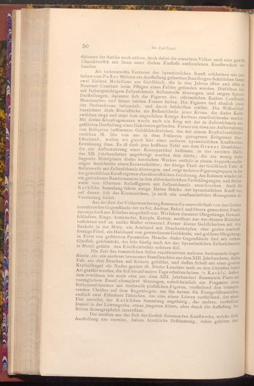 Die Zeit des roman ifchen Stiles repräfentirten mehrere bedeutende Gegenftände, als: ein niederer broncener Standleuchter aus dem XIII. Jahrhunderte, defien Fufs aus drei Drachen mit Reitern gebildet, und deffen Schaft mit einer grofsen Kryftallkugel als Nodus geziert ift. Diefer Leuchter mufs zu den fchönften feiner Art gezählt werden, die fich bis auf unfere Tage erhalten haben.( v. Kavàfs). Aufserdem erwähnen wir noch eine aus dem XIII. Jahrhundert ftammende Platte mit vorzüglichem Email champlevé überzogen, wahrfcheinlich ein Fragment eines Reliquienfchreines mit theilweife plaftifchen Figuren, vorftellend den triumphirenden Chriftus auf dem Regenbogen, um ihn herum die Evangeliſtenzeichen, endlich zwei Elfenbein Täfelchen, das eine einen Löwen vorftellend, der einen Efel zerreifst, der Rath'fchen Sammlung angehörig, das andere, vorftellend Daniel in der Löwengrube, etwas jüngeren Alters, aber durch die Auffaffung des Bildes ikonographifch intereffant.