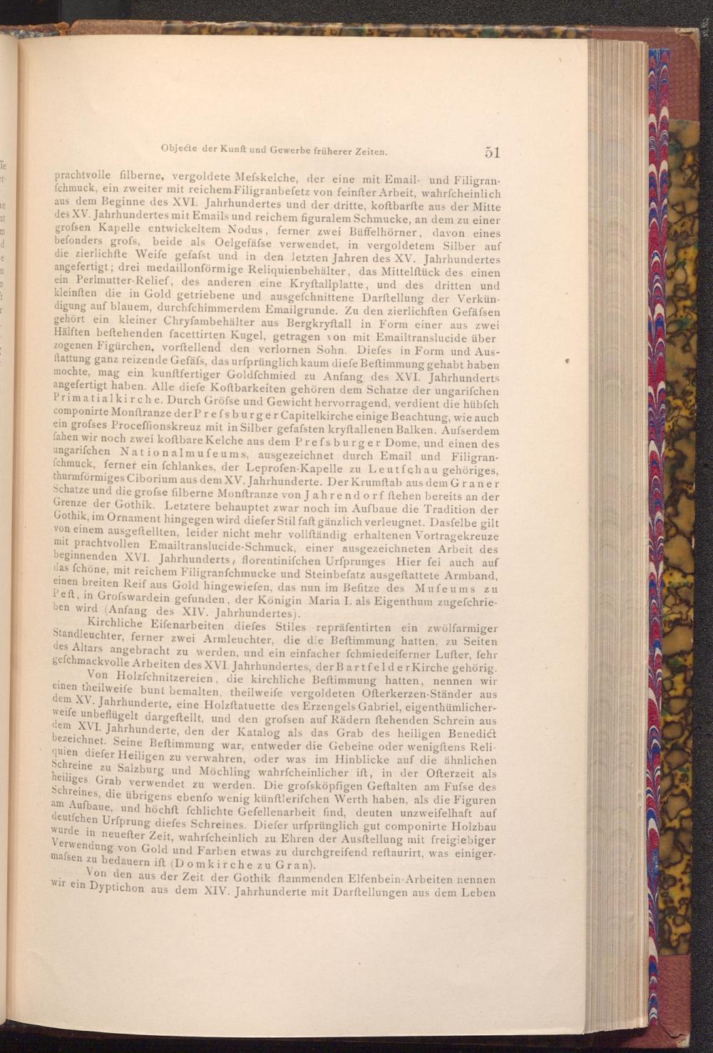 prachtvolle filberne, vergoldete Mefskelche, der eine mit Email- und Filigranfchmuck, ein zweiter mit reichem Filigranbefetz von feinfter Arbeit, wahrfcheinlich aus dem Beginne des XVI. Jahrhundertes und der dritte, koftbarfte aus der Mitte des XV. Jahrhundertes mit Emails und reichem figuralem Schmucke, an dem zu einer grofsen Kapelle entwickeltem Nodus, ferner zwei Büffelhörner, davon eines befonders grofs, beide als Oelgefäfse verwendet, in vergoldetem Silber auf die zierlichfte Weife gefafst und in den letzten Jahren des XV. Jahrhundertes angefertigt; drei medaillonförmige Reliquienbehälter, das Mittelftück des einen ein Perlmutter- Relief, des anderen eine Kryftallplatte, und des dritten und kleinften die in Gold getriebene und ausgefchnittene Darftellung der Verkündigung auf blauem, durchfchimmerdem Emailgrunde. Zu den zierlichften Gefäfsen gehört ein kleiner Chryfambehälter aus Bergkryftall in Form einer aus zwei Hälften beftehenden facettirten Kugel, getragen von mit Emailtranslucide über zogenen Figürchen, vorftellend den verlornen Sohn. Diefes in Form und Ausftattung ganz reizende Gefäfs, das urfprünglich kaum diefe Beftimmung gehabt haben mochte, mag ein kunftfertiger Goldfchmied zu Anfang des XVI. Jahrhunderts angefertigt haben. Alle diefe Koftbarkeiten gehören dem Schatze der ungarifchen Primatialkirche. Durch Gröfse und Gewicht hervorragend, verdient die hübfch componirte Monftranze der Prefsburger Capitelkirche einige Beachtung, wie auch ein grofses Proceffionskreuz mit in Silber gefafsten kryftallenen Balken. Ausserdem fahen wir noch zwei koftbare Kelche aus dem Prefsburger Dome, und einen des ungarifchen Nationalmufeums, ausgezeichnet durch Email und Filigranfchmuck, ferner ein fchlankes, der Leprofen- Kapelle zu Leutfchau gehöriges, thurmförmiges Ciborium aus dem XV. Jahrhunderte. Der Krumftab aus dem Graner Schatze und die grofse filberne Monftranze von Jahrendorf ftehen bereits an der Grenze der Gothik. Letztere behauptet zwar noch im Aufbaue die Tradition der Gothik, im Ornament hingegen wird diefer Stil faft gänzlich verleugnet. Dasfelbe gilt von einem ausgeftellten, leider nicht mehr vollſtändig erhaltenen Vortragekreuze mit prachtvollen Emailtranslucide- Schmuck, einer ausgezeichneten Arbeit des beginnenden XVI. Jahrhunderts; florentinifchen Urfprunges Hier fei auch auf das fchöne, mit reichem Filigranfchmucke und Steinbefatz ausgeftattete Armband, einen breiten Reif aus Gold hingewiefen, das nun im Befitze des Muſeums zu Peft, in Grofswardein gefunden, der Königin Maria I. als Eigenthum zugefchrieben wird( Anfang des XIV. Jahrhundertes).