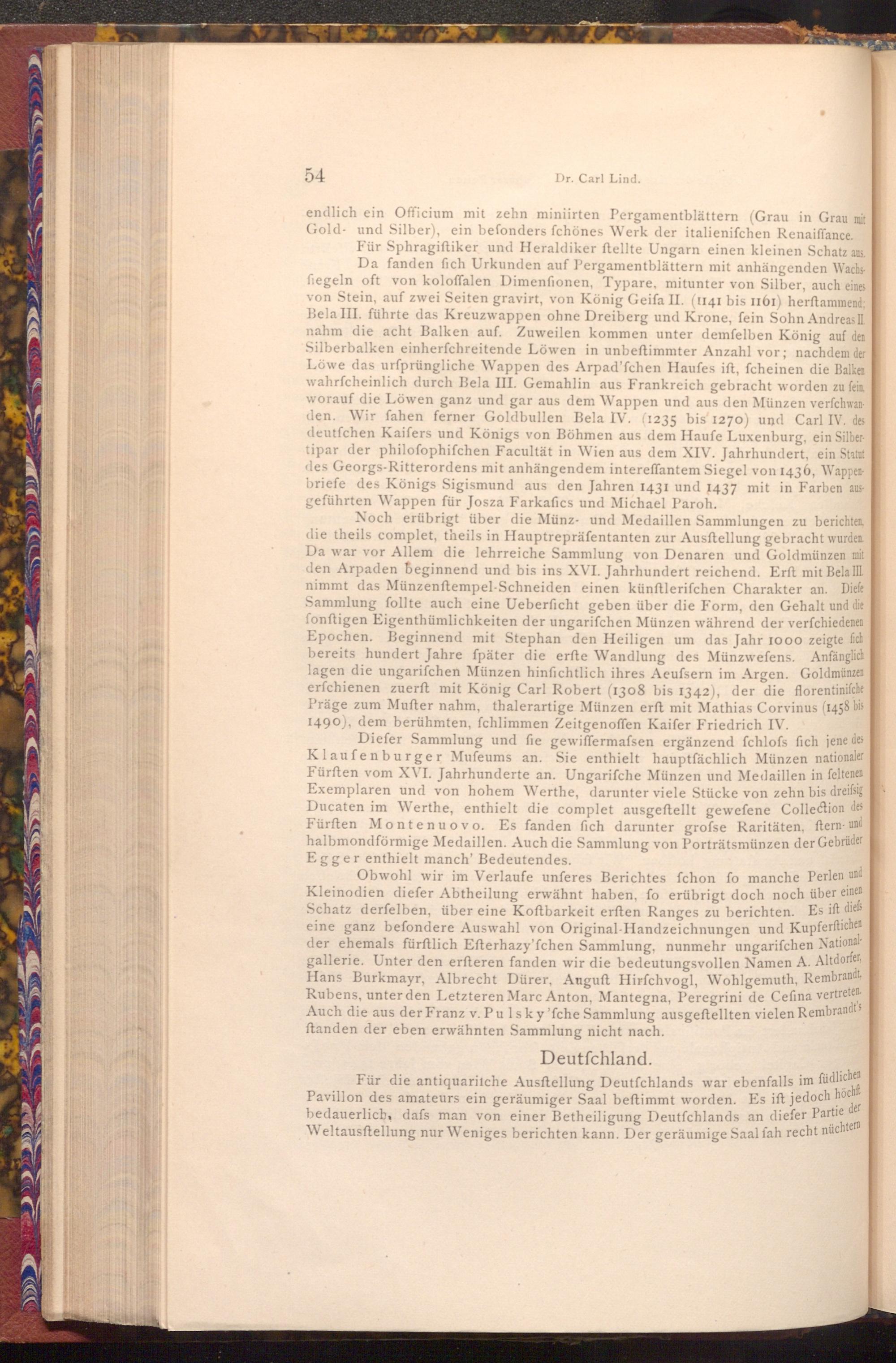 Für Sphragiftiker und Heraldiker ftellte Ungarn einen kleinen Schatz aus. Da fanden fich Urkunden auf Pergamentblättern mit anhängenden Wachsfiegeln oft von koloffalen Dimenfionen, Typare, mitunter von Silber, auch eines von Stein, auf zwei Seiten gravirt, von König Geifa II.( 1141 bis 1161) herftammend; Bela III. führte das Kreuzwappen ohne Dreiberg und Krone, fein Sohn Andreas II. nahm die acht Balken auf. Zuweilen kommen unter demfelben König auf den Silberbalken einherfchreitende Löwen in unbeftimmter Anzahl vor; nachdem der Löwe das urfprüngliche Wappen des Arpad'fchen Haufes ift, fcheinen die Balken wahrfcheinlich durch Bela III. Gemahlin aus Frankreich gebracht worden zu fein, worauf die Löwen ganz und gar aus dem Wappen und aus den Münzen verfchwan den. Wir fahen ferner Goldbullen Bela IV.( 1235 bis 1270) und Carl IV. des deutfchen Kaifers und Königs von Böhmen aus dem Haufe Luxenburg, ein Silbertipar der philofophifchen Facultät in Wien aus dem XIV. Jahrhundert, ein Statut des Georgs- Ritterordens mit anhängendem intereffantem Siegel von 1436, Wappenbriefe des Königs Sigismund aus den Jahren 1431 und 1437 mit in Farben ausgeführten Wappen für Josza Farkafics und Michael Paroh.
