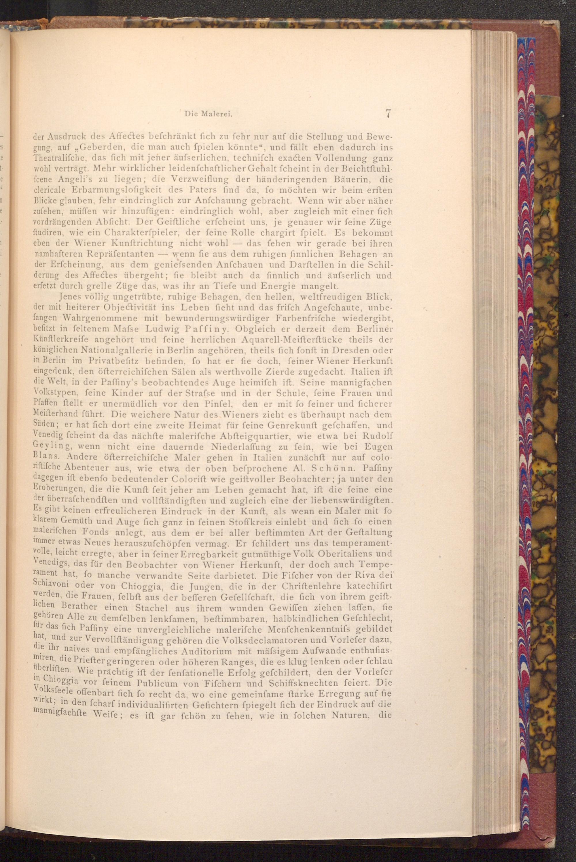 Jenes völlig ungetrübte, ruhige Behagen, den hellen, weltfreudigen Blick, der mit heiterer Objectivität ins Leben fieht und das frifch Angefchaute, unbefangen Wahrgenommene mit bewunderungswürdiger Farbenfrifche wiedergibt, befitzt in feltenem Mafse Ludwig Paffiny. Obgleich er derzeit dem Berliner Künftlerkreife angehört und feine herrlichen Aquarell- Meifterftücke theils der königlichen Nationalgallerie in Berlin angehören, theils fich fonft in Dresden oder in Berlin im Privatbefitz befinden, fo hat er fie doch, feiner Wiener Herkunft eingedenk, den öfterreichifchen Sälen als werthvolle Zierde zugedacht. Italien ift die Welt, in der Paffiny's beobachtendes Auge heimifch ift. Seine mannigfachen Volkstypen, feine Kinder auf der Strafse und in der Schule, feine Frauen und Pfaffen ftellt er unermüdlich vor den Pinfel, den er mit fo feiner und ficherer Meifterhand führt. Die weichere Natur des Wieners zieht es überhaupt nach dem Süden; er hat fich dort eine zweite Heimat für feine Genrekunft gefchaffen, und Venedig fcheint da das nächfte malerifche Abfteigquartier, wie etwa bei Rudolf Geyling, wenn nicht eine dauernde Niederlaffung zu fein, wie bei Eugen Blaas. Andere öfterreichifche Maler gehen in Italien zunächft nur auf coloriftifche Abenteuer aus, wie etwa der oben befprochene Al. Schönn. Paffiny dagegen ift ebenfo bedeutender Colorift wie geiftvoller Beobachter; ja unter den Eroberungen, die die Kunft feit jeher am Leben gemacht hat, ift die feine eine der überraschendften und vollſtändigften und zugleich eine der liebenswürdigften. Es gibt keinen erfreulicheren Eindruck in der Kunft, als wenn ein Maler mit fo klarem Gemüth und Auge fich ganz in feinen Stoffkreis einlebt und fich fo einen malerifchen Fonds anlegt, aus dem er bei aller beftimmten Art der Geftaltung immer etwas Neues herauszufchöpfen vermag. Er fchildert uns das temperamentvolle, leicht erregte, aber in feiner Erregbarkeit gutmüthige Volk Oberitaliens und Venedigs, das für den Beobachter von Wiener Herkunft, der doch auch Temperament hat, fo manche verwandte Seite darbietet. Die Fifcher von der Riva dei