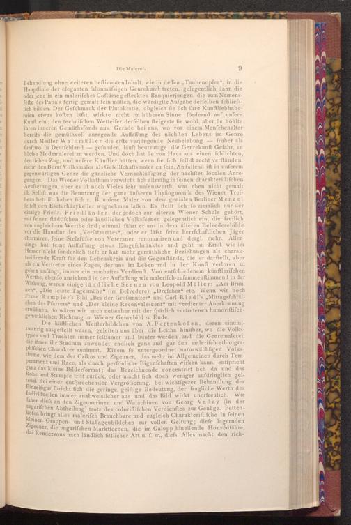Die köftlichen Meifterbildchen von A. Pettenkofen, deren einundzwanzig ausgeftellt waren, geleiten uns über die Leitha hinüber, wo die Volkstypen und Trachten immer feltfamer und bunter werden und die Genremalerei, die ihnen ihr Studium zuwendet, endlich ganz und gar den malerifch ethnographifchen Charakter annimmt. Einem fo untergeordnet naturwüchfigen Volksthume, wie dem der Czikos und Zigeuner, das mehr im Allgemeinen durch Temperament und Race, als durch perfönliche Eigenfchaften wirken kann, entſpricht ganz das kleine Bilderformat; das Bezeichnende concentrirt fich da und das Rohe und Stumpfe tritt zurück, oder macht fich doch weniger aufdringlich geltend. Bei einer entsprechenden Vergröfserung, bei wichtigerer Behandlung der Einzelfigur fpricht fich die geringe, geiftige Bedeutung, der fragliche Werth des Individuellen immer unabweislicher aus und das Bild wirkt unerfreulich. Wir fahen diefs an den Zigeunerinen und Walachinen von Georg Vaftay( in der ungarifchen Abtheilung) trotz des coloriftifchen Verdienftes zur Genüge. Pettenkofen bringt alles malerifch Brauchbare und zugleich Charakteriftifche in feinen kleinen Gruppen- und Staffagenbildchen zur vollen Geltung; diefe lagernden Zigeuner, die ungarifchen Marktfcenen, die im Galopp hineilende Honvédfähre, das Rendezvous nach ländlich- fittlicher Art u. f. w., diefs Alles macht den rich