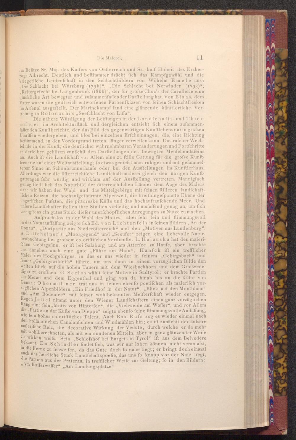 Die nähere Würdigung der Leiftungen in der Landfchafts- und Thiermalerei, im Architekturftück und dergleichen entzieht fich einem zuſammenfaffenden Kunftberichte, der das Bild des gegenwärtigen Kunftlebens nur in grofsen Umriffen wiedergeben, und blos bei einzelnen Erfcheinungen, die, eine Richtung beftimmend, in den Vordergrund treten, länger verweilen kann. Das rafcher Wechfelnde in der Kunft; die deutlicher wahrnehmbaren Veränderungen und Fortfchritte in derfelben gehören zunächft den Darftellungen des bewegten Menfchendafeins an. Auch ift die Landfchaft vor Allem eine zu ftille Gattung für die grofse Kunftfcenerie auf einer Weltausftellung; fo etwas geniefst man ruhiger und mit gefammelterem Sinne im Schönbrunnerhaufe oder bei den Ausstellungen im Künftlerhaus. Allerdings war die öfterreichifche Landfchaftsmalerei gleich den übrigen Kunftgattungen fehr würdig und wirkfam auf der Ausftellung vertreten. Mannigfach genug ftellt fich das Naturbild der öfterreichifchen Länder dem Auge des Malers dar: wir haben den Wald und das Mittelgebirge mit feinen ftilleren landfchaftlichen Reizen, die hochaufgethürmte Alpenwelt, die breithingefpannte Ebene der ungarifchen Pufzten, die pittoreske Küfte und das hochaufraufchende Meer. Und unfere Landfchafter ftellen ihre Studien vielfeitig und umfaffend genug an, um fich wenigftens ein gutes Stück diefer unerfchöpflichen Anregungen zu Nutze zu machen.