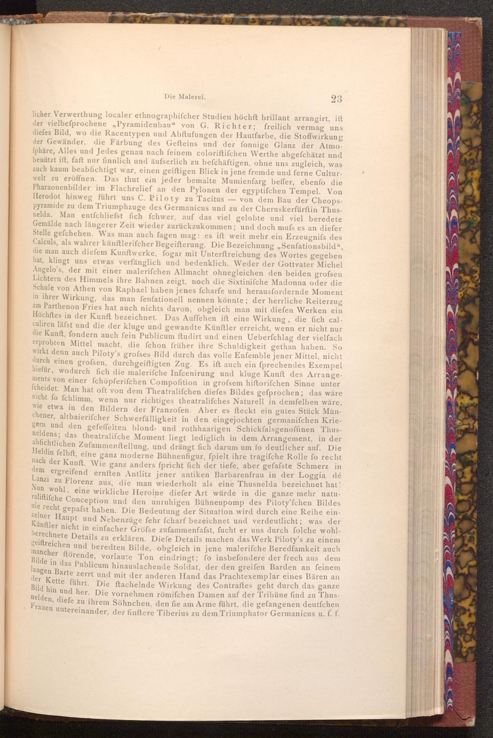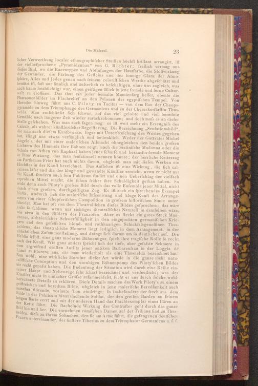licher Verwerthung localer ethnographifcher Studien höchft brillant arrangirt, ift der vielbefprochene" Pyramidenbau" von G. Richter; freilich vermag uns diefes Bild, wo die Racentypen und Abftufungen der Hautfarbe, die Stoffwirkung der Gewänder, die Färbung des Gefteins und der fonnige Glanz der Atmofphäre, Alles und Jedes genau nach feinem coloriftifchen Werthe abgefchätzt und benützt ift, faft nur finnlich und äufserlich zu befchäftigen, ohne uns zugleich, was auch kaum beabfichtigt war, einen geiftigen Blick in jene fremde und ferne Culturwelt zu eröffnen. Das thut ein jeder bemalte Mumienfarg beffer, ebenfo die Pharaonenbilder im Flachrelief an den Pylonen der egyptifchen Tempel. Von Herodot hinweg führt uns C. Piloty zu Tacitus von dem Bau der Cheopspyramide zu dem Triumphzuge des Germanicus und zu der Cheruskerfürftin Thusnelda. Man entfchliefst fich fchwer, auf das viel gelobte und viel beredete Gemälde nach längerer Zeit wieder zurückzukommen; und doch mufs es an diefer Stelle gefchehen. Was man auch fagen mag: es iſt weit mehr ein Erzeugnifs des Calculs, als wahrer künftlerifcher Begeifterung. Die Bezeichnung„ Senfationsbild", die man auch diefem Kunftwerke, fogar mit Unterftreichung des Wortes gegeben hat, klingt uns etwas verfänglich und bedenklich. Weder der Gottvater Michel Angelo's, der mit einer malerifchen Allmacht ohnegleichen den beiden grofsen Lichtern des Himmels ihre Bahnen zeigt, noch die Sixtinifche Madonna oder die Schule von Athen von Raphael haben jenes fcharfe und herausfordernde Moment in ihrer Wirkung, das man fenfationell nennen könnte; der herrliche Reiterzug am Parthenon Fries hat auch nichts davon, obgleich man mit diefen Werken ein Höchftes in der Kunft bezeichnet. Das Auffehen ift eine Wirkung, die fich calculiren läfst und die der kluge und gewandte Künftler erreicht, wenn er nicht nur die Kunft, fondern auch fein Publicum ftudirt und einen Ueberfchlag der vielfach erprobten Mittel macht, die fchon früher ihre Schuldigkeit gethan haben. So wirkt denn auch Piloty's grofses Bild durch das volle Enfemble jener Mittel, nicht durch einen grofsen, durchgeiftigten Zug. Es ist auch ein fprechendes Exempel hiefür, wodurch fich die malerifche Infcenirung und kluge Kunft des Arrange. ments von einer fchöpferifchen Compofition in grofsem hiftorifchen Sinne unter fcheidet. Man hat oft von dem Theatralifchen diefes Bildes gefprochen; das wäre nicht fo fchlimm, wenn nur richtiges theatralifches Naturell in demfelben wäre, wie etwa in den Bildern der Franzofen. Aber es fteckt ein gutes Stück Munchener, altbaierifcher Schwerfälligkeit in den eingejochten germanifchen Kriegern und den gefeffelten blond- und rothhaarigen Schickfalsgenoffinen Thusneldens; das theatralifche Moment liegt lediglich in dem Arrangement, in der abfichtlichen Zufammenftellung, und drängt fich darum um fo deutlicher auf. Die Heldin felbft, eine ganz moderne Bühnenfigur, fpielt ihre tragifche Rolle fo recht nach der Kunft. Wie ganz anders spricht fich der tiefe, aber gefafste Schmerz in dem ergreifend ernften Antlitz jener antiken Barbarenfrau in der Loggia dé Lanzi zu Florenz aus, die man wiederholt als eine Thusnelda bezeichnet hat! Nun wohl, eine wirkliche Heroine diefer Art würde in die ganze mehr natu raliftifche Conception und den unruhigen Bühnenpomp des Piloty'fchen Bildes nie recht gepasst haben. Die Bedeutung der Situation wird durch eine Reihe einzelner Haupt- und Nebenzüge fehr fcharf bezeichnet und verdeutlicht; was der Künftler nicht in einfacher Gröfse zufammenfasst, fucht er uns durch folche wohlberechnete Details zu erklären. Diefe Details machen das Werk Piloty's zu einem geiftreichen und beredten Bilde, obgleich in jene malerifche Beredfamkeit auch mancher ftörende, vorlaute Ton eindringt; fo insbefondere der frech aus dem Bilde in das Publicum hinauslachende Soldat, der den greifen Barden an feinem langen Barte zerrt und mit der anderen Hand das Prachtexemplar eines Bären an der Kette führt. Die ftachelnde Wirkung des Contraftes geht durch das ganze Bild hin und her. Die vornehmen römifchen Damen auf der Tribüne find zu Thusnelden, diefe zu ihrem Söhnchen, den fie am Arme führt, die gefangenen deutſchen Frauen untereinander, der finftere Tiberius zu dem Triumphator Germanicus u. f. f.