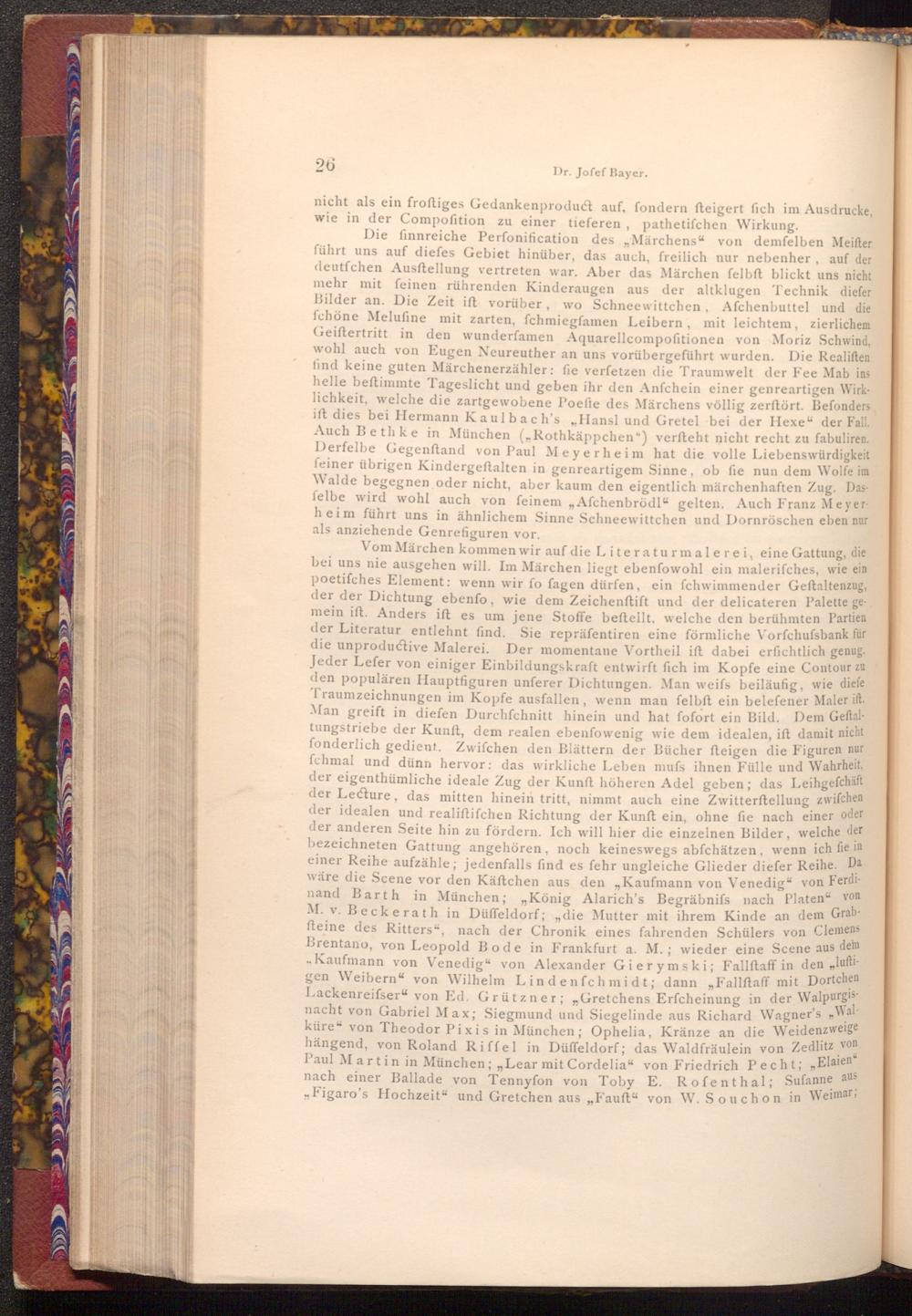 Vom Märchen kommen wir auf die Literaturmalerei, eine Gattung, die bei uns nie ausgehen will. Im Märchen liegt ebenfowohl ein malerifches, wie ein poetifches Element: wenn wir fo fagen dürfen, ein fchwimmender Geftaltenzug, der der Dichtung ebenfo, wie dem Zeichenftift und der delicateren Palette gemein ift. Anders ift es um jene Stoffe beftellt, welche den berühmten Partien der Literatur entlehnt find. Sie repräfentiren eine förmliche Vorfchufsbank für die unproductive Malerei. Der momentane Vortheil ift dabei erfichtlich genug. Jeder Lefer von einiger Einbildungskraft entwirft fich im Kopfe eine Contour zu den populären Hauptfiguren unferer Dichtungen. Man weifs beiläufig, wie diefe Traumzeichnungen im Kopfe ausfallen, wenn man felbft ein belefener Maler ift. Man greift in diefen Durchfchnitt hinein und hat fofort ein Bild. Dem Geftaltungstriebe der Kunft, dem realen ebenfowenig wie dem idealen, ift damit nicht fonderlich gedient. Zwifchen den Blättern der Bücher fteigen die Figuren nur fchmal und dünn hervor: das wirkliche Leben mufs ihnen Fülle und Wahrheit, der eigenthümliche ideale Zug der Kunft höheren Adel geben; das Leihgefchäft der Lecture, das mitten hinein tritt, nimmt auch eine Zwitterftellung zwifchen der idealen und realiftifchen Richtung der Kunft ein, ohne fie nach einer oder der anderen Seite hin zu fördern. Ich will hier die einzelnen Bilder, welche der bezeichneten Gattung angehören, noch keineswegs abfchätzen, wenn ich fie in einer Reihe aufzähle; jedenfalls find es fehr ungleiche Glieder diefer Reihe. Da wäre die Scene vor den Käftchen aus den„ Kaufmann von Venedig" von Ferdinand Barth in München;„ König Alarich's Begräbnifs nach Platen" von M. v. Beckerath in Düffeldorf; die Mutter mit ihrem Kinde an dem Grabfteine des Ritters", nach der Chronik eines fahrenden Schülers von Clemens Brentano, von Leopold Bode in Frankfurt a. M.; wieder eine Scene aus dem Kaufmann von Venedig" von Alexander Gierymski; Fallſtaff in den„ lufti gen Weibern" von Wilhelm Lindenfchmidt; dann Fallftaff mit Dortchen Lackenreifser" von Ed. Grützner;„ Gretchens Erfcheinung in der Walpurgis nacht von Gabriel Max; Siegmund und Siegelinde aus Richard Wagner's küre" von Theodor Pixis in München; Ophelia, Kränze an die Weidenzweige hängend, von Roland Riffel in Düffeldorf; das Waldfräulein von Zedlitz von Paul Martin in München;„ Lear mit Cordelia" von Friedrich Pecht;„ Elaien nach einer Ballade von Tennyfon von Toby E. Rofenthal; Sufanne aus Figaro's Hochzeit" und Gretchen aus" Fauft" von W. Souchon in Weimar;