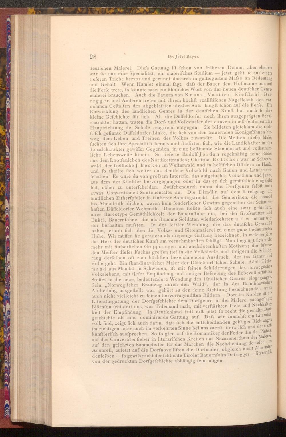 deutfchen Malerei. Diefe Gattung ift fchon von früherem Datum; aber ehedem war fie nur eine Specialität, ein malerifches Studium jetzt geht fie aus einem tieferen Triebe hervor und gewinnt dadurch in gefteigertem Mafse an Bedeutung und Gehalt. Wenn Hamlet einmal fagt, dafs der Bauer dem Hofmanne nun auf die Ferfe trete, fo könnte man ein ähnliches Wort von der neuen deutfchen Genremalerei brauchen. Auch die Bauern von Knaus, Vautier, Riefftahl, Def regger und Anderen treten mit ihrem höchft realiftifchen Nagelfchuh den vornehmen Geftalten des abgeblafsten idealen Stils längft fchon auf die Ferfe. Die Entwicklung des ländlichen Genres in der deutfchen Kunft hat auch fo ihre kleine Gefchichte für fich. Als die Düffeldorfer noch ihren ausgeprägten Schulcharakter hatten, traten die Dorf- und Volksmaler der conventionell fentimentalen Hauptrichtung der Schule reagirend entgegen. Sie bildeten gleichfam die realiftifch gefinnte Düffeldorfer Linke, die fich von den trauernden Königsföhnen hinweg dem Leben und Treiben des Volkes zuwandte. Die Meiften diefer Maler fuchten fich ihre Specialität heraus und ftudirten fich, wie die Landfchafter in den Localcharakter gewiffer Gegenden, in eine beſtimmte Stammesart und volksthüm liche Lebensweife hinein. So lieferte Rudolf Jordan regelmäfsig feine Bilder aus dem Lootfenleben des Nordfeeftrandes; Chriftian Böttcher war im Schwarzwald, der treffliche J. Becker im Wefterwald und in heffifchen Dörfern zu Haufe, und fo theilte fich weiter das deutfche Volksbild nach Gauen und Landsmannfchaften. Es wäre da von grofsem Intereffe, das aufgefuchte Volksthum und jenes, aus dem der Künftler hervorgegangen oder in das er fich gemüthlich eingelebt hat, näher zu unterfcheiden. Zwifchendurch nahm das Dorfgenre felbft auch etwas Conventionell Sentimentales an. Die Dirndl'n auf dem Kirchgang, die ländlichen Zitherfpieler in fauberer Sonntagstracht, die Sennerinen, die finnend ins Abendroth blicken, waren kein fonderlicher Gewinn gegenüber der Schatten haften Düffeldorfer Wehmuth. Daneben ftellte fich auch eine zwar gefündere, aber ftereotype Gemüthlichkeit der Bauernftube ein, bei der Grofsmutter und Enkel, Bauernföhne, die als ftramme Soldaten wiederkehrten u. f. w. immer wieder herhalten mufsten. In der letzten Wendung, die das deutfche Genrebild nahm, erhob fich aber die Volks- und Sittenmalerei zu einer ganz bedeutenden Höhe. Wir müffen fie geradezu als diejenige Gattung bezeichnen, in welcher jetzt das Herz der deutfchen Kunft am vernehmbarften fchlägt. Man begnügt fich nicht mehr mit äufserlichen Gruppirungen und anekdotenhaften Motiven; die führenden Meifter diefes Faches greifen tief in die Volksfeele und fteigern die Schilderung derfelben oft zum höchften bezeichnenden Ausdruck, der ins Ganze und Volle geht. Ein fkandinavifcher Maler der Düffeldorf'fchen Schule, Adolf Tidemand aus Mandal in Schweden, ift mit feinen Schilderungen des norwegifchen Volkslebens, mit tiefer Empfindung und inniger Befeelung des liebevoll erfafsten Stoffes in die neue, bedeutendere Wendung des ländlichen Genres eingegangen. Sein„ Norwegifcher Brautzug durch den Wald", der in der fkandinavifchen Abtheilung ausgeftellt war, gehört zu den feine Richtung bezeichnenden, wenn auch nicht vielleicht zu feinen hervorragendften Bildern. Dort im Norden ift die Literaturgattung der Dorfgefchichte dem Dorfgenre in der Malerei nachgefolgt; Björnfon fchildert uns, was Tidemand malt, mit verſtärkter Tiefe und Nachhaltig keit der Empfindung. In Deutfchland tritt erft jetzt fo recht die gemalte Dorf gefchichte als eine dominirende Gattung auf. Dafs wir zunächst ein Literaturvolk find, zeigt fich auch darin, dafs fich die entfcheidenden geiftigen Richtungen im richtigen oder auch im verkehrten Sinne bei uns zuerft literarifch und dann erft künftlerifch ausfprechen. So folgten auf die Romantiker der Feder die des Pinfels, auf das Convertitenfieber in literarifchen Kreifen das Nazarenerthum der Malerei, auf den gelehrten Sammeleifer für das Märchen die Nachdichtung desfelben im Aquarell, zuletzt auf die Dorfnovelliften die Dorfmaler, obgleich nicht Alle unter denfelben- fo gewifs nicht der fchlichte Tiroler Bauernfohn Defregger- literarifch von der gedruckten Dorfgefchichte abhängig fein mögen.