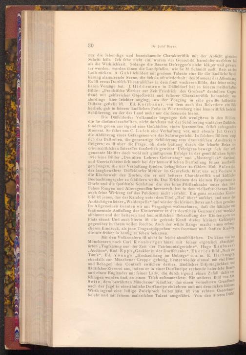 nur die lebendige und bezeichnende Charakteriſtik mit der Abficht gleichen Schritt hält. Ich fehe nicht ein, warum das Genrebild harmlofer ausfehen foll als die Wirklichkeit. Solange die Bauern Defregger's nicht klüger und geweckter werden, werden ihnen die Landpfaffen, wie fie M. Schmidt malt, ftets an den Leib rücken. A. Gabl fchildert mit grofsem Talente eine für die ländliche Bevöl kerung alarmirende Scene, die fich da oft wiederholt: den Moment der Affentirung. Es ift etwas Dörfifch- Theatralifches in dem fonft wackeren Bilde, das feine unleug baren Vorzüge hat. J. Hiddemann in Düffeldorf hat in feinem meifterhaften Bilde: Preufsifche Werber zur Zeit Friedrich des Grofsen" denfelben Gegenftand mit geiftreicher Objectivität und fefterer Charakteriſtik behandelt, was alerdings hier leichter anging, wo der Vorgang in eine gewiffe hiftorifche Diftanz geftellt ift. Ed. Kurzbauer, von dem auch das Belvedere ein Bild herlieh, gab in feinem ländlichen Fefte in Württemberg eine humoriftifch belebte Schilderung, zu der das Land mehr nur die Scenerie bietet.