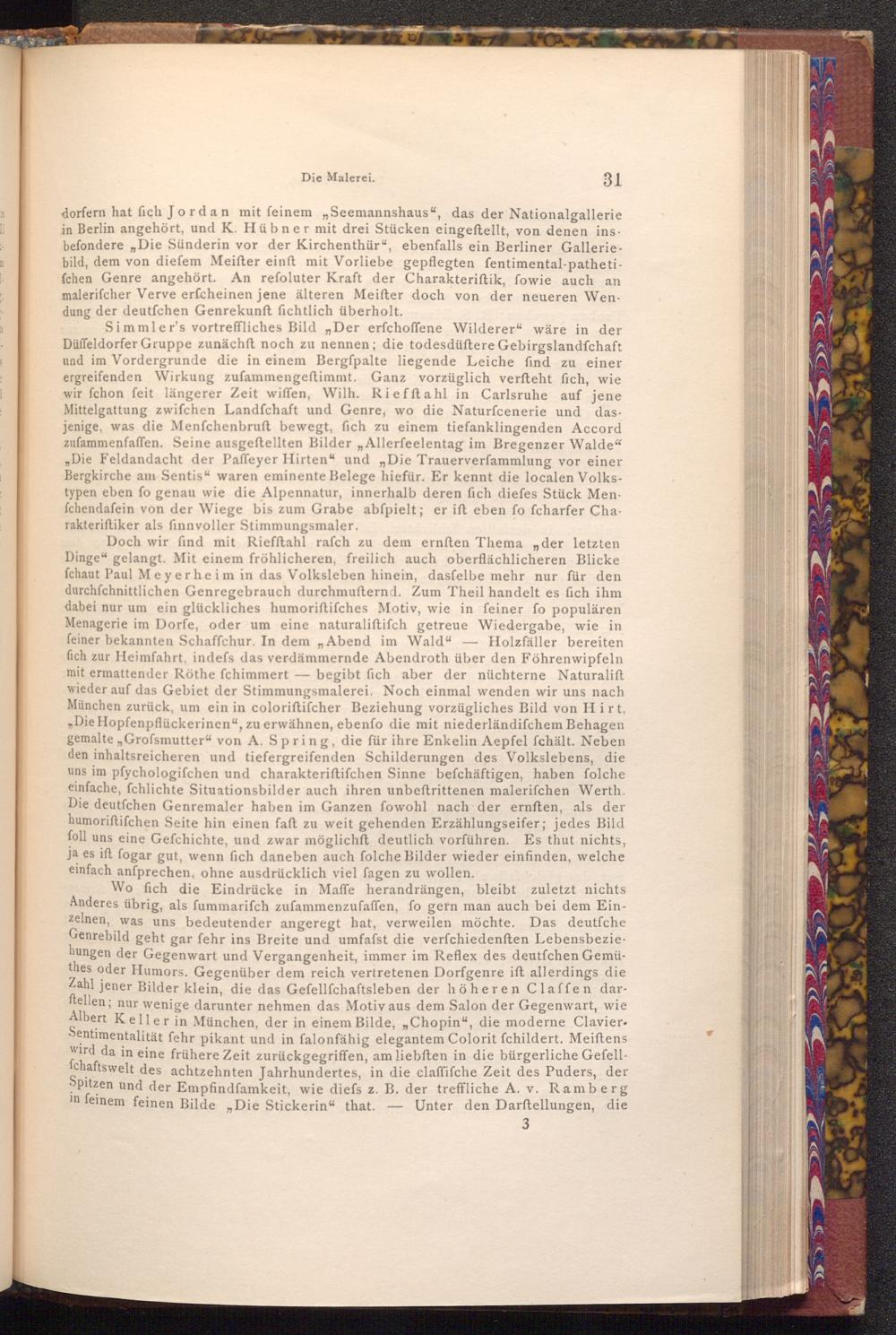 Wo fich die Eindrücke in Maffe herandrängen, bleibt zuletzt nichts Anderes übrig, als fummarifch zufammenzufaffen, fo gern man auch bei dem Einzelnen, was uns bedeutender angeregt hat, verweilen möchte. Das deutſche Genrebild geht gar fehr ins Breite und umfafst die verfchiedenften Lebensbeziehungen der Gegenwart und Vergangenheit, immer im Reflex des deutfchen Gemü thes oder Humors. Gegenüber dem reich vertretenen Dorfgenre ift allerdings die Zahl jener Bilder klein, die das Gefellſchaftsleben der höheren Claffen darftellen; nur wenige darunter nehmen das Motiv aus dem Salon der Gegenwart, wie Albert Keller in München, der in einem Bilde,„ Chopin", die moderne ClavierSentimentalität fehr pikant und in falonfähig elegantem Colorit fchildert. Meiftens wird da in eine frühere Zeit zurückgegriffen, am liebften in die bürgerliche Gefellfchaftswelt des achtzehnten Jahrhundertes, in die claffifche Zeit des Puders, der Spitzen und der Empfindfamkeit, wie diefs z. B. der treffliche A. v. Ramberg in feinem feinen Bilde„ Die Stickerin" that. Unter den Darftellungen, die