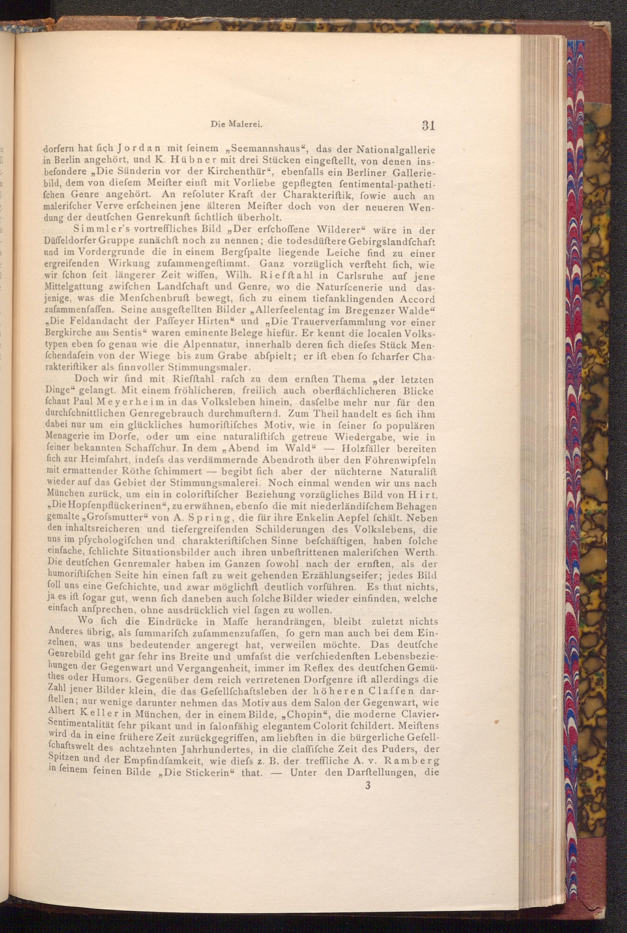 Doch wir find mit Riefftahl rafch zu dem ernften Thema der letzten Dinge" gelangt. Mit einem fröhlicheren, freilich auch oberflächlicheren Blicke fchaut Paul Meyerheim in das Volksleben hinein, dasfelbe mehr nur für den durchſchnittlichen Genregebrauch durchmufternd. Zum Theil handelt es fich ihm dabei nur um ein glückliches humoriftifches Motiv, wie in feiner fo populären Menagerie im Dorfe, oder um eine naturaliftifch getreue Wiedergabe, wie in feiner bekannten Schaffchur. In dem„ Abend im Wald" Holzfäller bereiten fich zur Heimfahrt, indefs das verdämmernde Abendroth über den Föhrenwipfeln mit ermattender Röthe fchimmert begibt fich aber der nüchterne Naturalift wieder auf das Gebiet der Stimmungsmalerei. Noch einmal wenden wir uns nach München zurück, um ein in coloriftifcher Beziehung vorzügliches Bild von Hirt, „ Die Hopfenpflückerinen", zu erwähnen, ebenfo die mit niederländifchem Behagen gemalte ,, Grofsmutter" von A. Spring, die für ihre Enkelin Aepfel fchält. Neben den inhaltsreicheren und tiefergreifenden Schilderungen des Volkslebens, die uns im pfychologifchen und charakteriftifchen Sinne befchäftigen, haben folche einfache, fchlichte Situationsbilder auch ihren unbeftrittenen malerifchen Werth. Die deutfchen Genremaler haben im Ganzen fowohl nach der ernften, als der humoriftifchen Seite hin einen faft zu weit gehenden Erzählungseifer; jedes Bild foll uns eine Gefchichte, und zwar möglichft deutlich vorführen. Es thut nichts, ja es ift fogar gut, wenn fich daneben auch folche Bilder wieder einfinden, welche einfach anfprechen, ohne ausdrücklich viel fagen zu wollen.