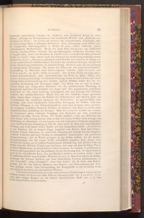 Kunftweife ausreichend bekannt ift, illuftrirte den deutfchen Krieg in zwei Bildern:„ Einzug des Kronprinzen in das brennende Wörth" und" Redoute von Chatillon vor Paris"; von beiden ift letzteres das bedeutendere, überhaupt eine der allervorzüglichften Leiftungen Bleibtreu's. Der„ Uebergang nach Alfen" aus der königlichen Nationalgallerie in Berlin ift eines feiner früheren, fchon wohlbekannten Meifterbilder. Wenn wir noch Emil Hünten's aus Düffeldorf lebendig charakterifirtes Gefecht der grofsherzoglich heffifchen Divifion vom 18. Auguft 1870, fowie des Berliners A. von Werner vortreffliches Bild ,, General Moltke vor Paris", dann zuletzt noch das während der Ausftellung vielbesprochene Zeitbild von Gyfis ,, Napoleon gefangen" nach Gebühr hervorheben, fo wären wir mit der unmittelbaren künftlerifchen Ausbeute des deutfchen Krieges, wie fie fich auf der Ausstellung präfentirte, fo ziemlich fertig. Nicht fo ganz mit der Gattung des Kriegsbildes überhaupt. Da wären vor Allem aus der polnifchen Künftlerniederlaffung in München zwei hervorragende Talente, Jofef Brandt und M. Gierymski, an diefer Stelle zu nennen. Der Erftere ftellte ein ganz imponirendes Schlachtenbild, Die Türkenfchlacht bei Wien im Jahre 1683", aus, welches in dem grofsen Zuge der Kampfbewegung, fowie in der reichen und doch haltungsvollen Farbenwirkung den meiften andern Bildern diefer Art auf der deutfchen Ausftellung fich überlegen zeigte. Vor Allem war es eine in dramatifchem Sinne gut componirte Schlacht, wo die entfcheidende Wendung im Kampfe mit finnlicher Deutlichkeit vors Auge tritt. Die gepanzerten polnifchen Reiter find es, die, eben keilartig vordringend und das Gewoge der Schlacht theilend, mit unwiderftehlicher Macht fich auf das türkifche Lager geworfen haben; hinter ihnen dringen die Reihen der Oefterreicher und Baiern nach; im Vordergrunde die verftörten Gruppen der Fliehenden; im ganzen Bilde eine gewaltige, aber doch künftlerifch beherrfchte Bewegung der Maffen. Von dem deutfchen Phlegma in der Schlachtenmalerei wird man da kaum etwas gewahr; das erregtere polnifche Naturell förderte da fichtlich den Maler in diefer mehr phantafiereichen Auffaffung des Krieges. Max Gierymski erzählt uns wieder, der Gegenwart näher rückend, Vorgänge und Epifoden aus dem polnifchen Aufftande von 1864. Friedr. Pecht, der diefen Künftler wohl von München her näher kennt, hebt richtig hervor, dafs es ihm bei feinen Stoffen doch weniger um Darftellung der Menfchen, als um irgend eine mit befonderer Prägnanz ausgefprochene landfchaftliche Stimmung zu thun ift. Aber diefe ift eben von bezeichnender Wirkung, und wirft einen vollen Reflex auf den Gegenftand felbft. So fchildert er uns Kofaken, die in langem Zuge, begleitet von Raben, über eine fchneebedeckte Fläche hinreiten, fo winterlich fchaurig und traurig wie nur möglich; polnifche Vedetten auf einer Strafse in brennender Sommerglut; ein polnifches Infurgentencorps, das im Walde gelagert in der Frühe auffitzt, wo die heitere Morgenftimmung, wie die Leute felbft, vortrefflich gegeben find; ferner eine Weichfelufer- Sonne, wo in tieffter Sommerabend Dämmerung fich allerlei Volk am Waffer umtreibt, Weiber, Kinder und Soldaten, und man auf dem höchften Theile des Ufers Häufer fieht, in denen fchon Lichter brennen. So einfach, fo gefliffentlich nüchtern- photographifch die Gegenstände in der Zeichnung find, fo eigenthümlich grofs ift der coloriftifche Reiz, den der Künftler darüber zu breiten weifs." Auch die köftlichen Bilder von Profeffor Wilhelm Dietz in München wären im Zufammenhange der kleinen Epifode aus dem foldatifchen Treiben mitzunennen; fo „ Der Ueberfall",„ Der Schimmel"," Vor dem Zelte". Es ift diefs eine Nebengattung, wie fie von älteren Meiftern des Genres, wie Wouvermann, mit Vorliebe gepflegt wurde; eine Verwerthung der Kriegsftoffs in der kleinften Dofis und lediglich im Sinne des malerifchen Motives.