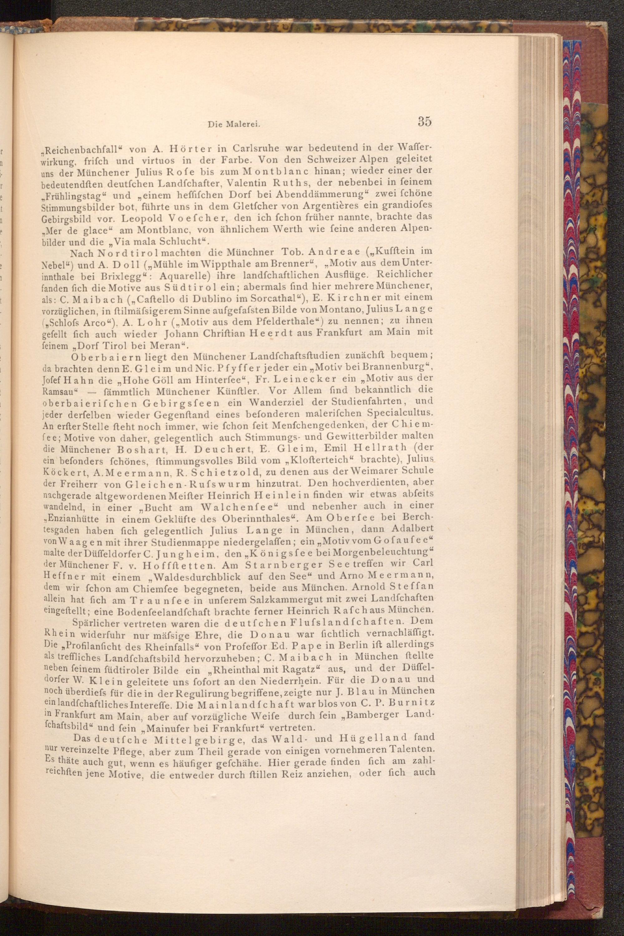 Nach Nordtirol machten die Münchner Tob. Andreae( ,, Kufftein im Nebel") und A. Doll(„ Mühle im Wippthale am Brenner"," Motiv aus dem Unterinnthale bei Brixlegg": Aquarelle) ihre landfchaftlichen Ausflüge. Reichlicher fanden fich die Motive aus Südtirol ein; abermals find hier mehrere Münchener, als: C. Maibach( ,, Caftello di Dublino im Sorcathal"), E. Kirchner mit einem vorzüglichen, in ftilmäfsigerem Sinne aufgefafsten Bilde von Montano, Julius Lange ( Schlofs Arco"). A. Lohr( ,, Motiv aus dem Pfelderthale") zu nennen; zu ihnen gefellt fich auch wieder Johann Chriftian Heerdt aus Frankfurt am Main mit feinem Dorf Tirol bei Meran".