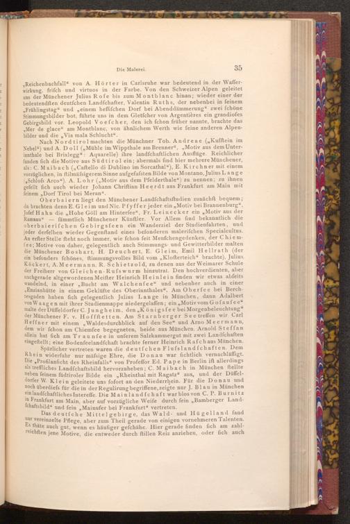 Spärlicher vertreten waren die deutfchen Flufslandfchaften. Dem Rhein widerfuhr nur mässige Ehre, die Donau war fichtlich vernachläffigt. Die„ Profilanficht des Rheinfalls" von Profeffor Ed. Pape in Berlin ift allerdings als treffliches Landfchaftsbild hervorzuheben; C. Maibach in München ftellte neben feinem füdtiroler Bilde ein„ Rheinthal mit Ragatz" aus, und der Düffeldorfer W. Klein geleitete uns fofort an den Niederrhein. Für die Donau und noch überdiefs für die in der Regulirung begriffene, zeigte nur J. Blau in München ein landfchaftliches Intereffe. Die Mainlandfchaft war blos von C. P. Burnitz in Frankfurt am Main, aber auf vorzügliche Weife durch fein„ Bamberger Landfchaftsbild" und fein„ Mainufer bei Frankfurt" vertreten.