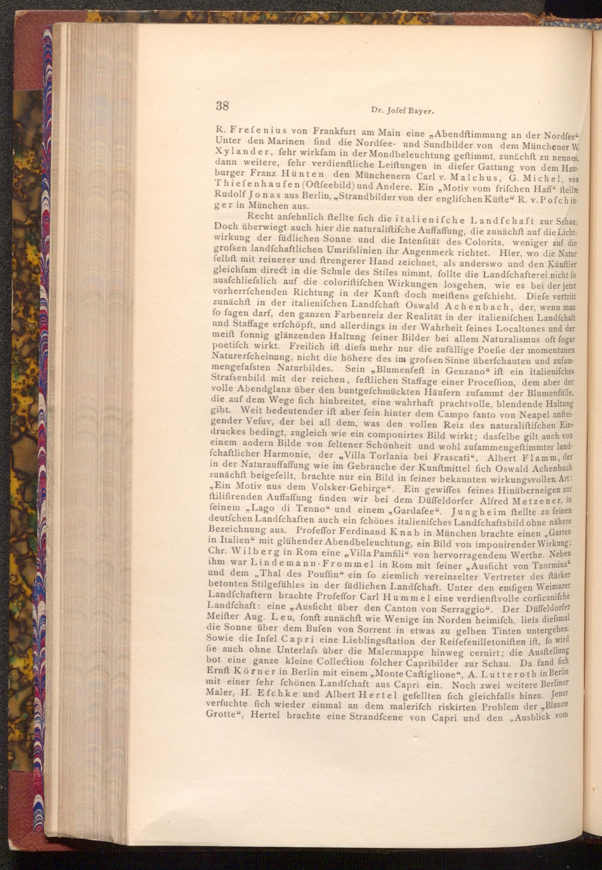 Recht anfehnlich ſtellte fich die italienifche Landfchaft zur Schau. Doch überwiegt auch hier die naturaliftifche Auffaffung, die zunächft auf die Lichtwirkung der füdlichen Sonne und die Intenfität des Colorits, weniger auf die grofsen landfchaftlichen Umrifslinien ihr Augenmerk richtet. Hier, wo die Natur felbft mit reinerer und ftrengerer Hand zeichnet, als anderswo und den Künftler gleichfam direct in die Schule des Stiles nimmt, follte die Landfchafterei nicht fo ausfchliesslich auf die coloriftifchen Wirkungen losgehen, wie es bei der jetzt vorherrschenden Richtung in der Kunft doch meiftens gefchieht. Diefe vertritt zunächft in der italienifchen Landfchaft Oswald Achenbach, der, wenn man fo fagen darf, den ganzen Farbenreiz der Realität in der italienifchen Landfchaft und Staffage erfchöpft, und allerdings in der Wahrheit feines Localtones und der meift fonnig glänzenden Haltung feiner Bilder bei allem Naturalismus oft fogar poetifch wirkt. Freilich ift diefs mehr nur die zufällige Poefie der momentanen Naturerfcheinung, nicht die höhere des im grofsen Sinne überfchauten und zufammengefafsten Naturbildes. Sein„ Blumenfeft in Genzano" ift ein italienifches Strafsenbild mit der reichen, feftlichen Staffage einer Proceffion, dem aber der volle Abendglanz über den buntgefchmückten Häufern zufammt der Blumenfülle, die auf dem Wege fich hinbreitet, eine wahrhaft prachtvolle, blendende Haltung gibt. Weit bedeutender ift aber fein hinter dem Campo fanto von Neapel anfteigender Vefuv, der bei all dem, was den vollen Reiz des naturaliftifchen Eindruckes bedingt, zugleich wie ein componirtes Bild wirkt; dasfelbe gilt auch von einem andern Bilde von feltener Schönheit und wohl zufammengeftimmter landfchaftlicher Harmonie, der„ Villa Torlania bei Frascati". Albert Flamm, der in der Naturauffaffung wie im Gebrauche der Kunftmittel fich Oswald Achenbach zunächft beigefellt, brachte nur ein Bild in feiner bekannten wirkungsvollen Art: ,, Ein Motiv aus dem Volsker- Gebirge". Ein gewiffes feines Hinüberneigen zur ftilifirenden Auffaffung finden wir bei dem Düffeldorfer Alfred Metzener, in feinem„, Lago di Tenno" und einem„ Gardafee". Jungheim ftellte zu feinen deutfchen Landfchaften auch ein fchönes italienifches Landfchaftsbild ohne nähere Bezeichnung aus. Profeffor Ferdinand Knab in München brachte einen Garten in Italien" mit glühender Abendbeleuchtung, ein Bild von imponirender Wirkung; Chr. Wilberg in Rom eine„ Villa Pamfili" von hervorragendem Werthe. Neben ihm war Lindemann- Frommel in Rom mit feiner Ausficht von Taormina" und dem„ Thal des Pouffin" ein fo ziemlich vereinzelter Vertreter des ftärker betonten Stilgefühles in der füdlichen Landfchaft. Unter den emfigen Weimarer Landfchaftern brachte Profeffor Carl Hummel eine verdienftvolle corficanifche Landfchaft: eine„ Ausficht über den Canton von Serraggio". Der Düffeldorfer Meifter Aug. Leu, fonft zunächft wie Wenige im Norden heimifch, liefs diefsmal die Sonne über dem Bufen von Sorrent in etwas zu gelben Tinten untergehen. Sowie die Infel Capri eine Lieblingsftation der Reifefeuilletoniften ift, fo wird fie auch ohne Unterlafs über die Malermappe hinweg cernirt; die Ausstellung bot eine ganze kleine Collection folcher Capribilder zur Schau. Da fand fich Ernft Körner in Berlin mit einem„ Monte Caftiglione", A. Lutteroth in Berlin mit einer fehr schönen Landfchaft aus Capri ein. Noch zwei weitere Berliner Maler, H. Efchke und Albert Hertel gefellten fich gleichfalls hinzu. Jener verfuchte fich wieder einmal an dem malerifch riskirten Problem der„ Blauen Grotte", Hertel brachte eine Strandfcene von Capri und den„ Ausblick vom