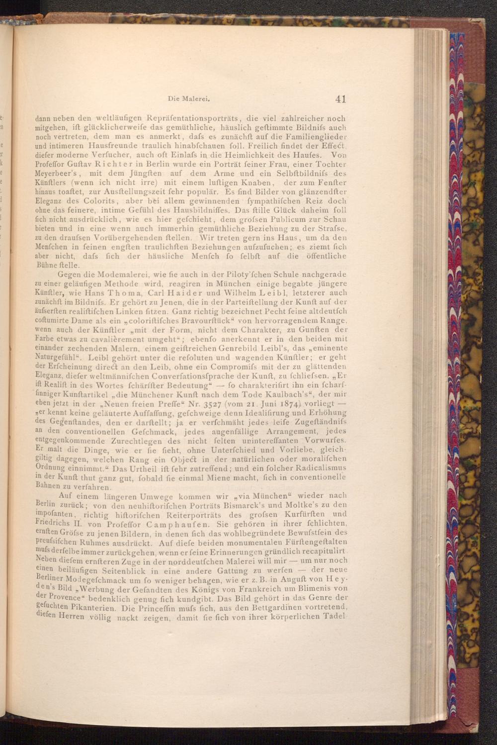 Gegen die Modemalerei, wie fie auch in der Piloty'fchen Schule nachgerade zu einer geläufigen Methode wird, reagiren in München einige begabte jüngere Künftler, wie Hans Thoma, Carl Haider und Wilhelm Leibl, letzterer auch zunächft im Bildnifs. Er gehört zu Jenen, die in der Parteiftellung der Kunft auf der äufserften realiftifchen Linken fitzen. Ganz richtig bezeichnet Pecht feine altdeutfch coftumirte Dame als ein ,, coloriftifches Bravourftück" von hervorragendem Range, wenn auch der Künftler mit der Form, nicht dem Charakter, zu Gunften der Farbe etwas zu cavalièrement umgeht"; ebenfo anerkennt er in den beiden mit einander zechenden Malern, einem geistreichen Genrebild Leibl's, das„, eminente Naturgefühl". Leibl gehört unter die refoluten und wagenden Künſtler; er geht der Erfcheinung direct an den Leib, ohne ein Compromifs mit der zu glättenden Eleganz, diefer weltmännifchen Converfationsfprache der Kunft, zu fchliefsen. ,, Er ift Realift in des Wortes fchärffter Bedeutung"-fo charakterifirt ihn ein fcharffinniger Kunftartikel die Münchener Kunft nach dem Tode Kaulbach's", der mir eben jetzt in der„ Neuen freien Preffe" Nr. 3527( vom 21. Juni 1874) vorliegt " er kennt keine geläuterte Auffaffung, gefchweige denn Idealifirung und Erhöhung des Gegenstandes, den er darftellt; ja er verfchmäht jedes leife Zugeftändniss an den conventionellen Gefchmack, jedes augenfällige Arrangement, jedes entgegenkommende Zurechtlegen des nicht felten unintereffanten Vorwurfes. Er malt die Dinge, wie er fie fieht, ohne Unterfchied und Vorliebe, gleichgiltig dagegen, welchen Rang ein Object in der natürlichen oder moralifchen Ordnung einnimmt." Das Urtheil ift fehr zutreffend; und ein folcher Radicalismus in der Kunft thut ganz gut, fobald fie einmal Miene macht, fich in conventionelle